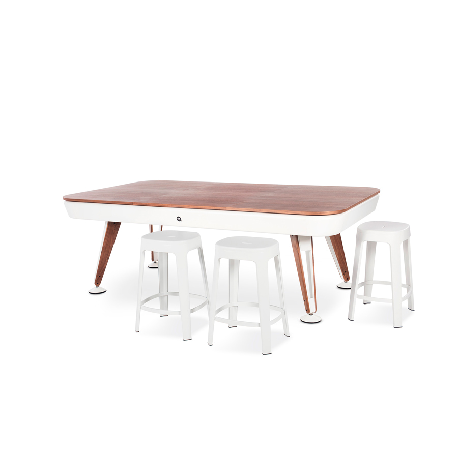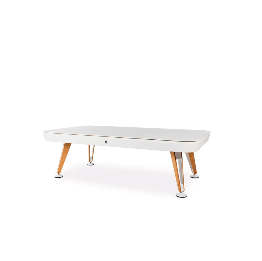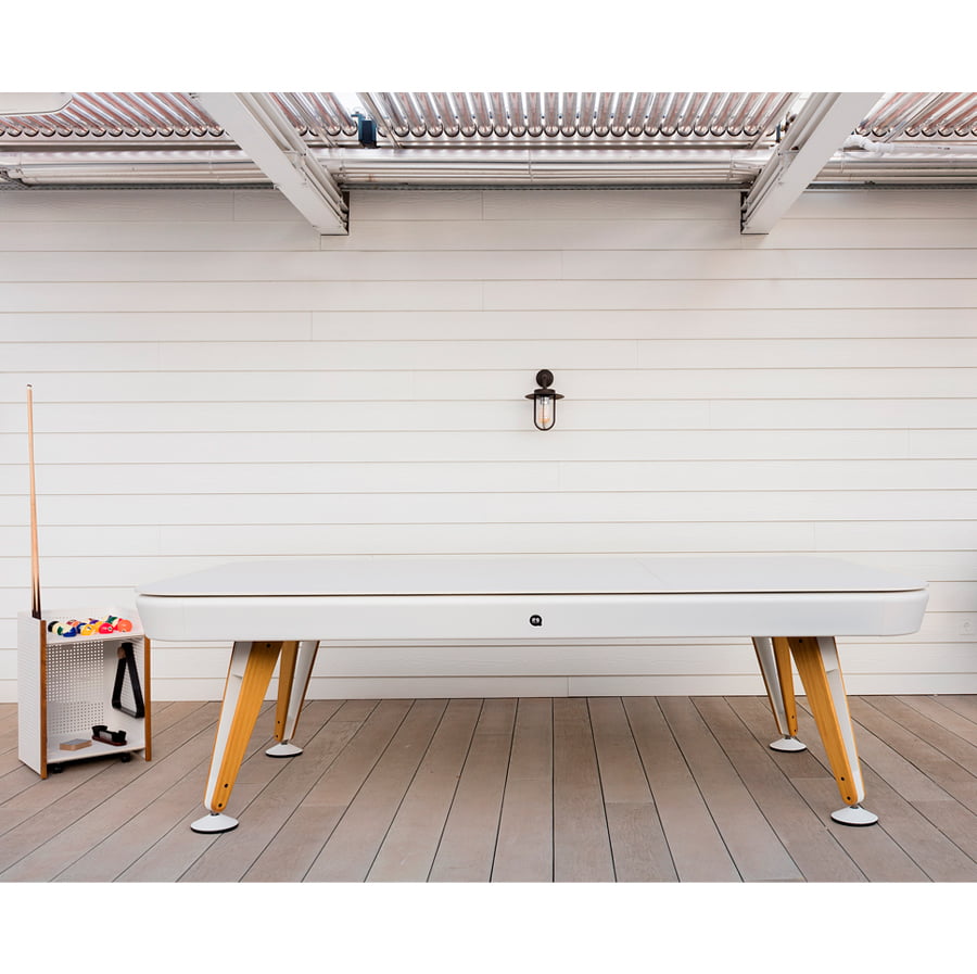 The dining top is available in iroko, walnut or oak wood (for indoor use) or in Fenix (for outdoor use), in the two sizes of the Diagonal pool table. A large dining table. A fabulous pool table.
