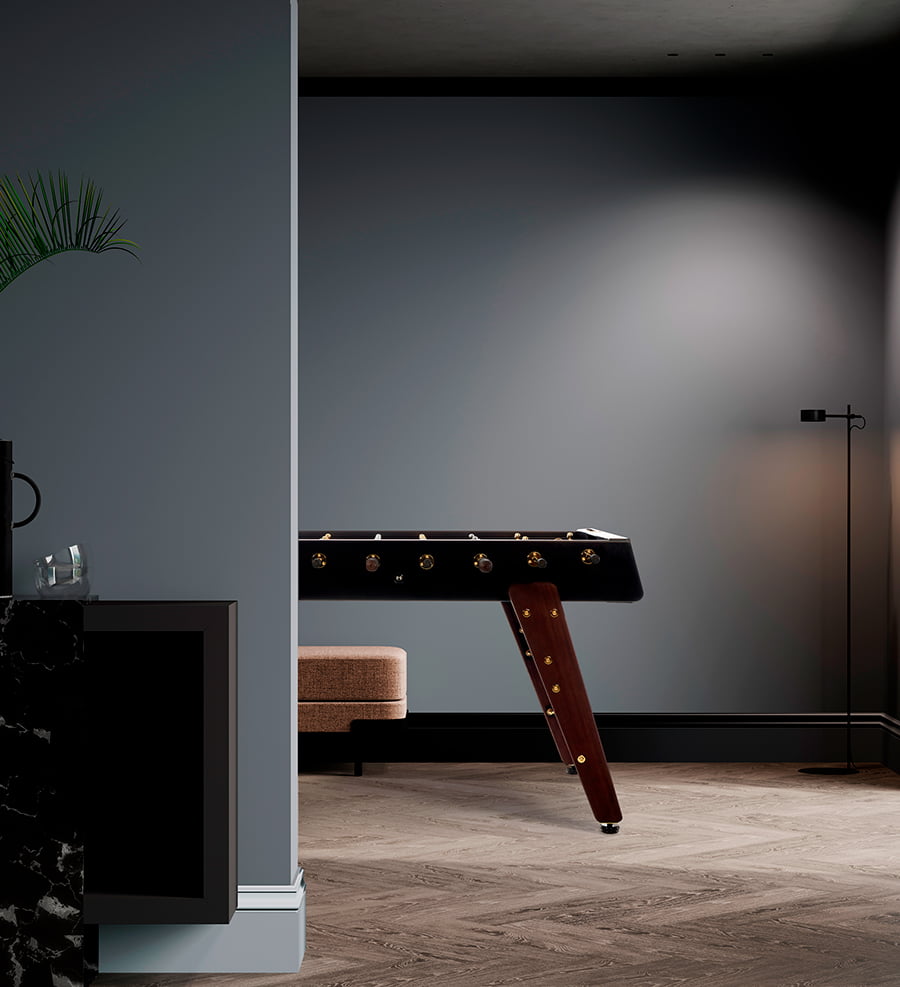 We’ve dressed our RS3 Wood football table to the nines. A bespoke suit with 24k gold-plated details, such as the goal counter, ball bearings and leg screws. We’ve dressed the players in gold and silver chrome plating and we’ve dyed the iroko wood legs to achieve a dark tone, while maintaining the texture and elegance of the grain. These glamourous touches combine with the black frame to create a unique, distinguished item.