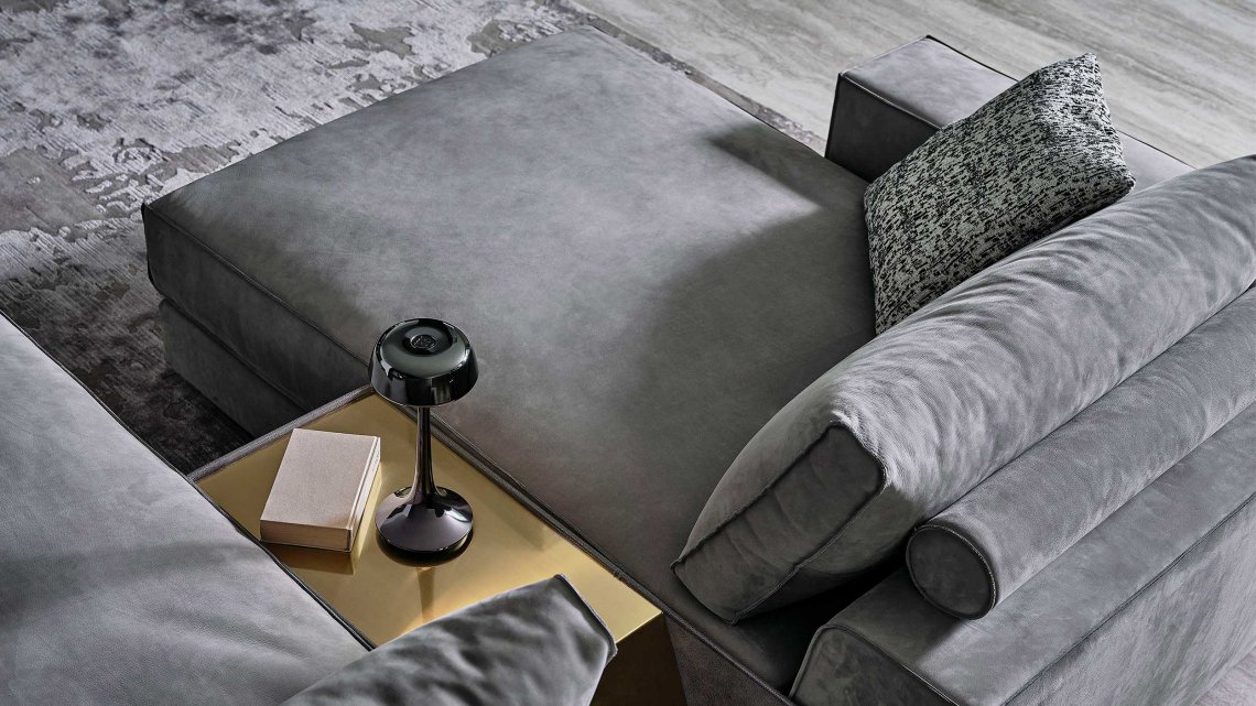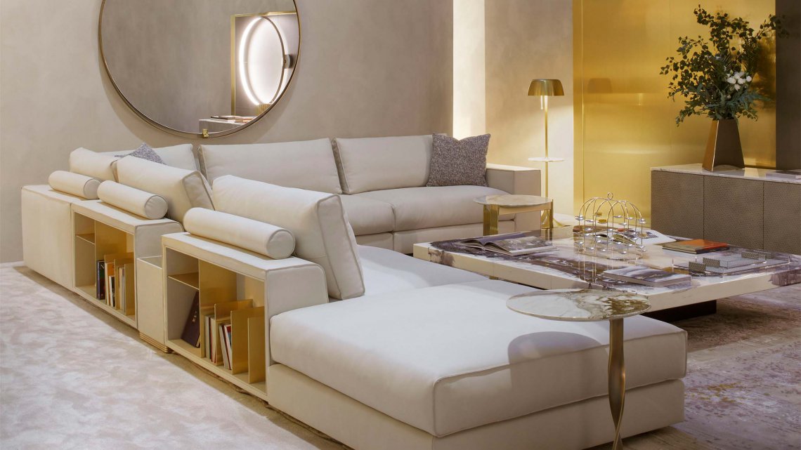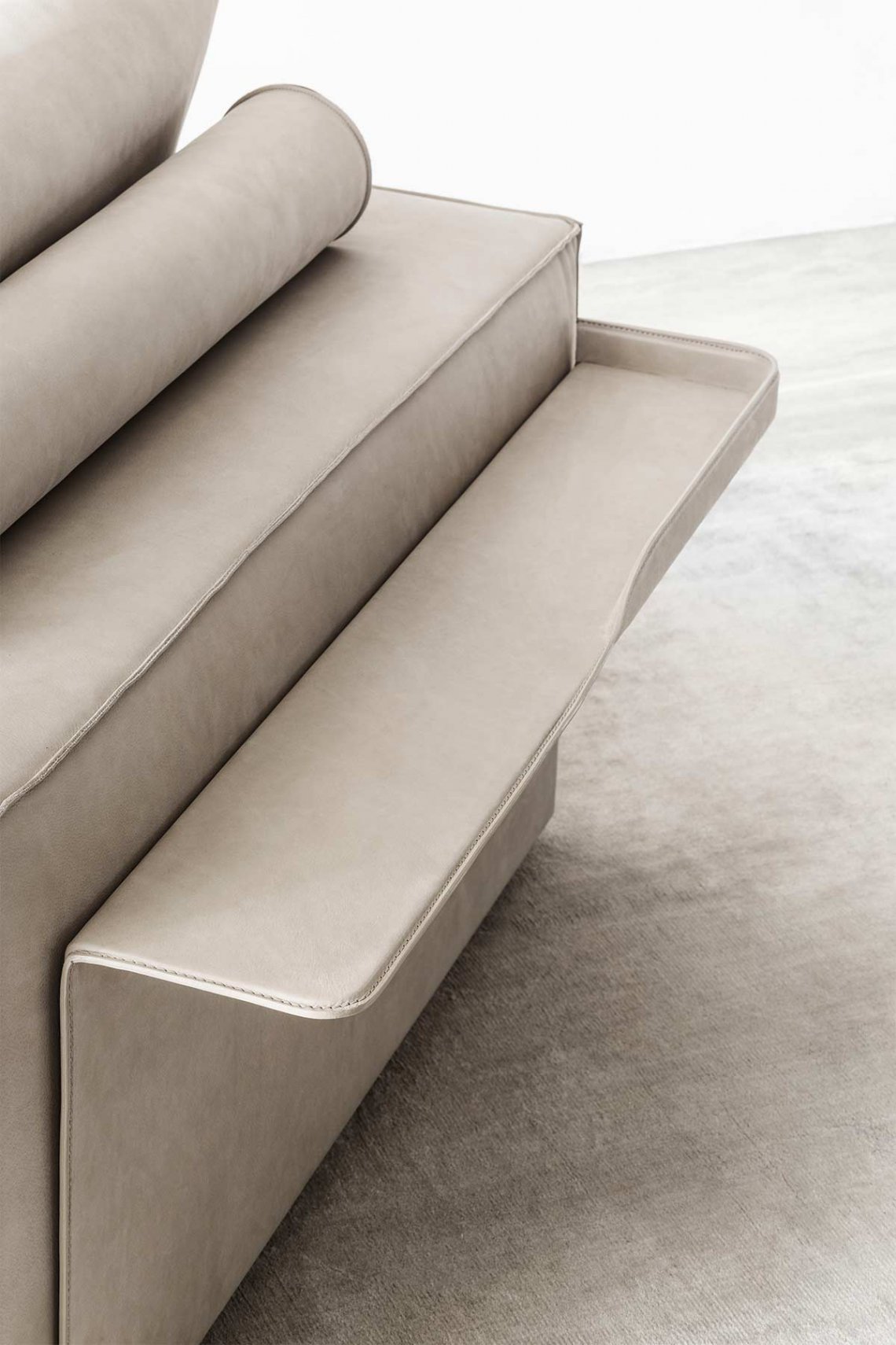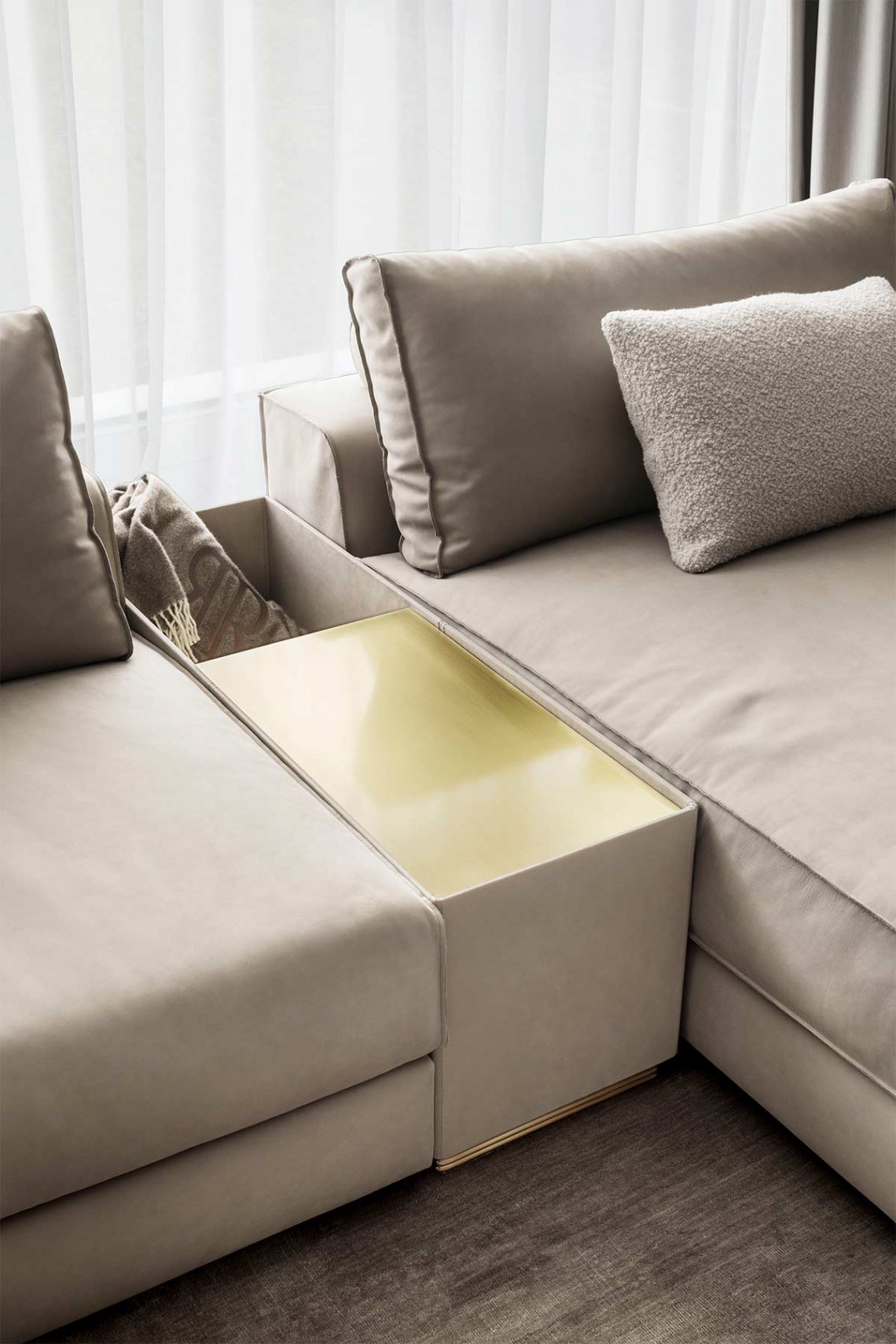 模塊化沙發系列以書架扶手、擱板靠背和邊桌單元為特色。還采用生切皮革。
