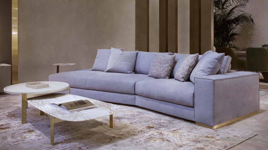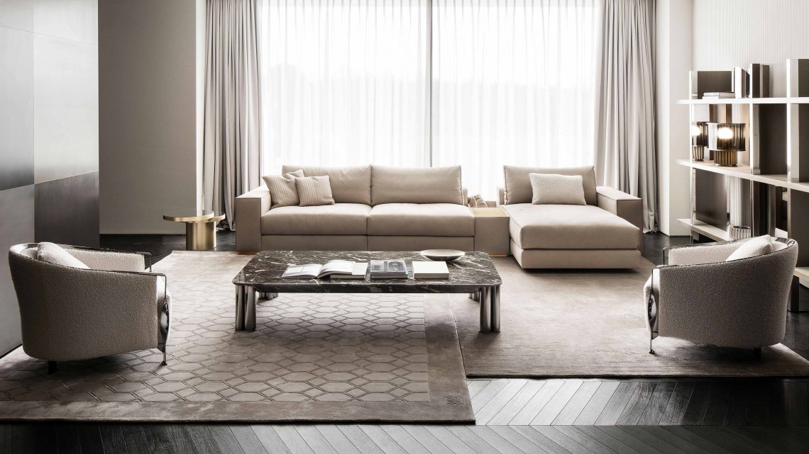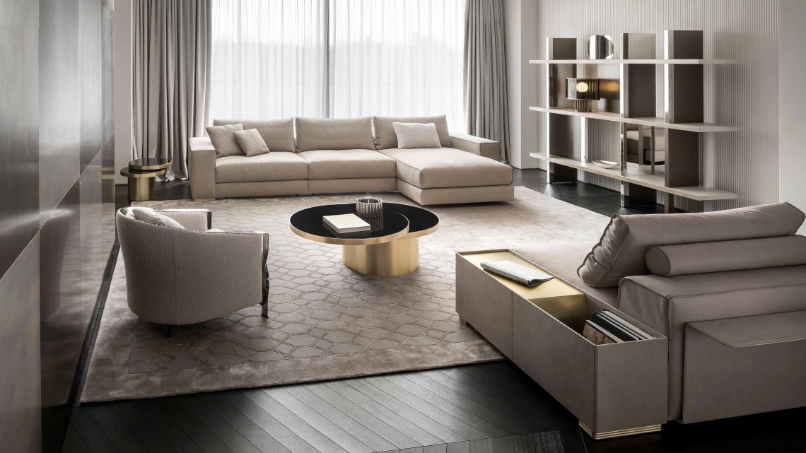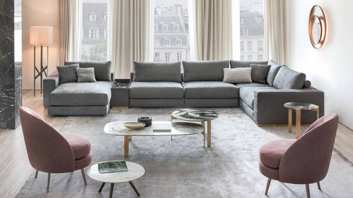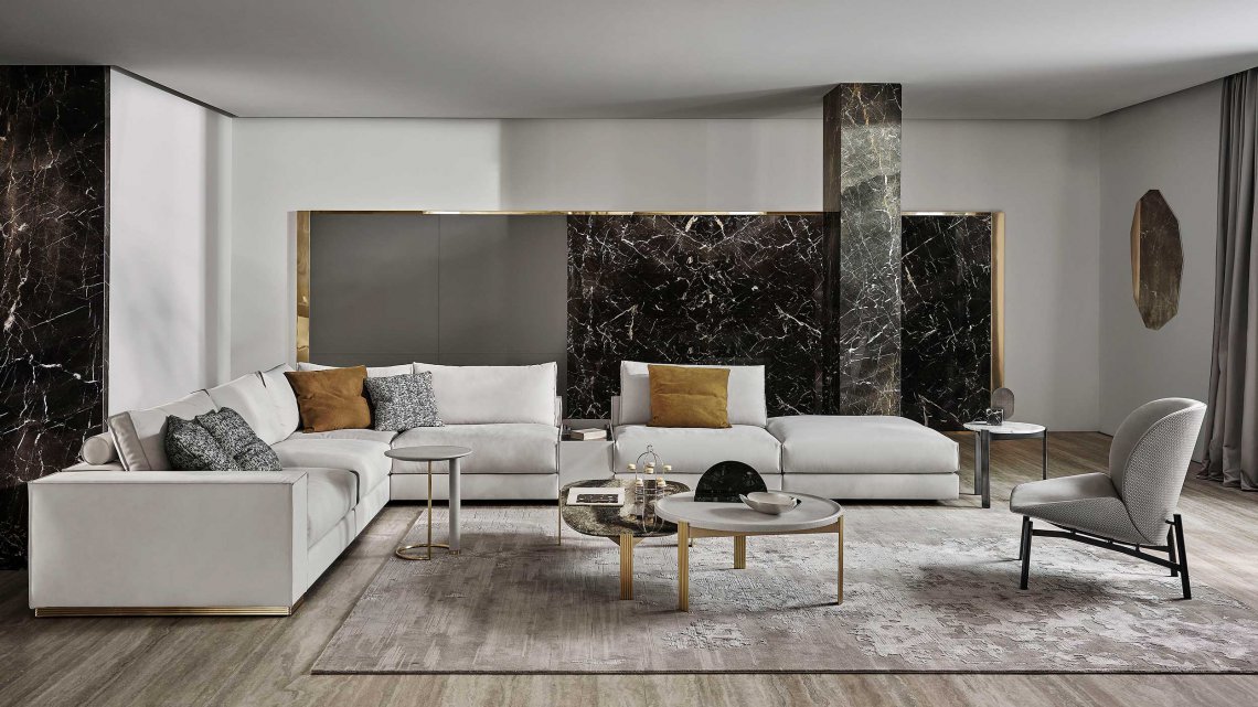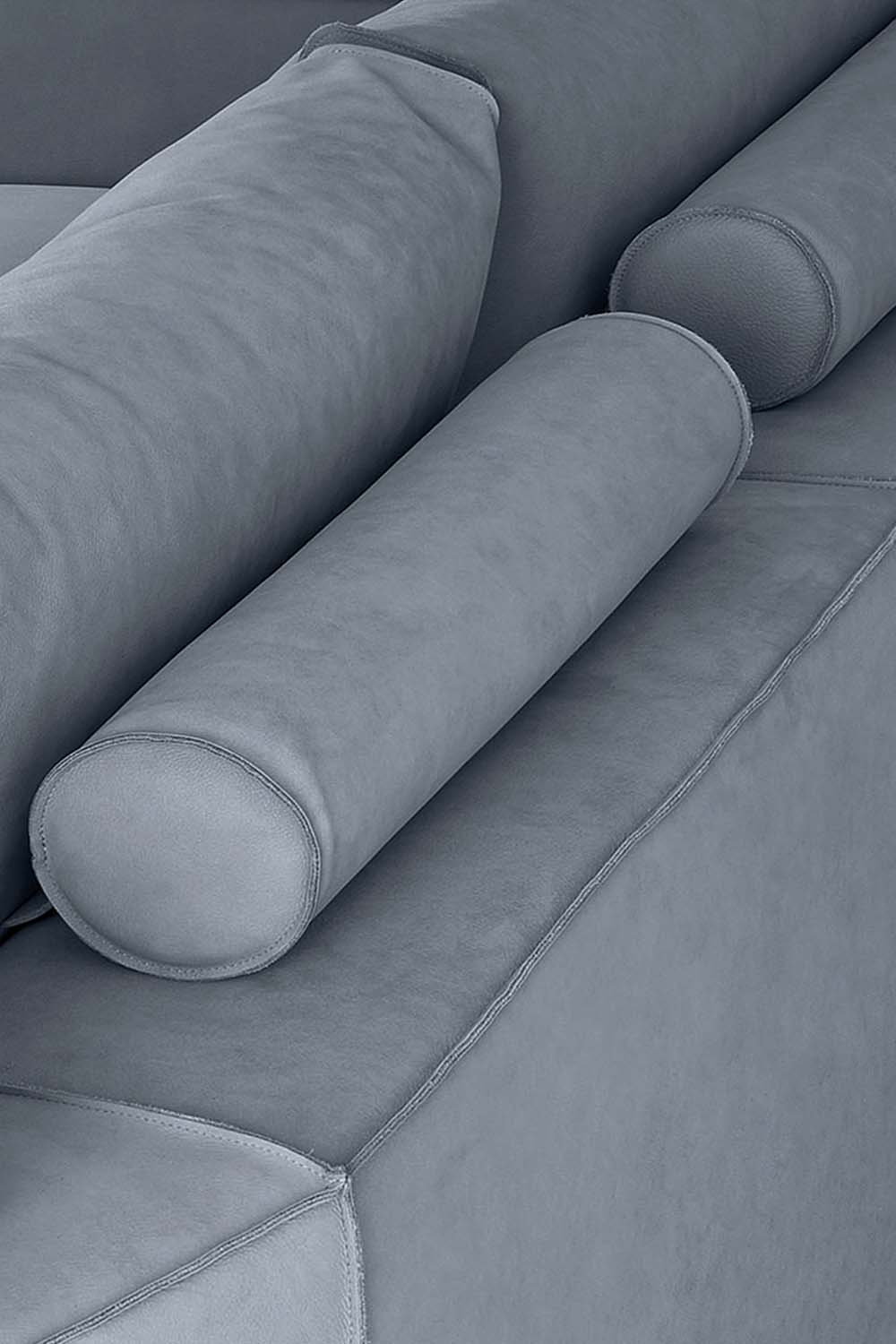 模塊化沙發系列以書架扶手、擱板靠背和邊桌單元為特色。還采用生切皮革。