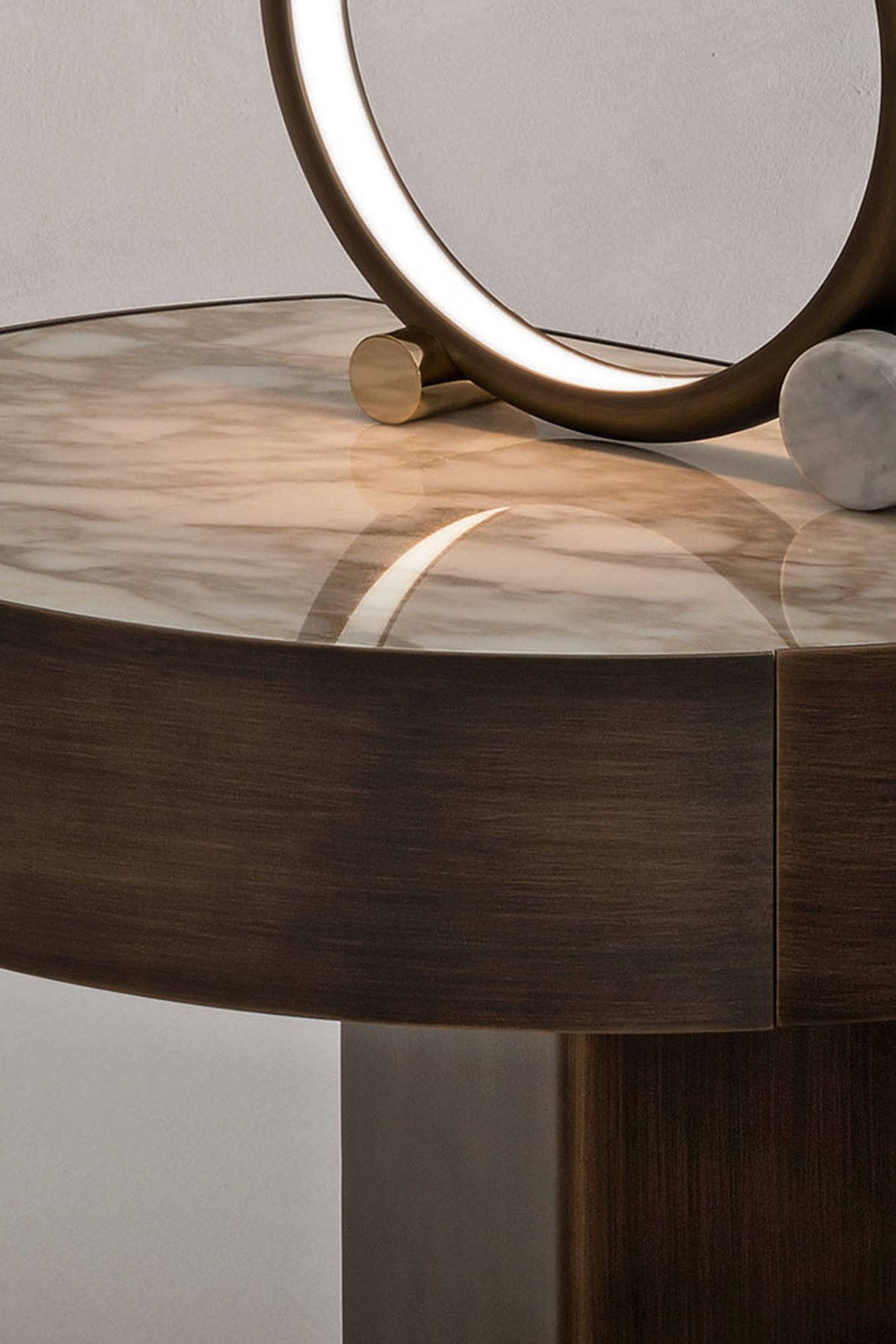 Inca 床頭柜結合了珍貴的材料和飾面,打造出一種樸素而優雅的設計,能夠提供新的美學功能解決方案。頂部和底部的兩個元素都具有圓形幾何形狀,賦予產品堅固而輕盈的感覺。
