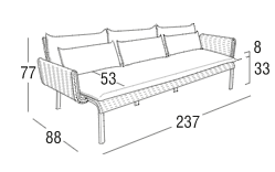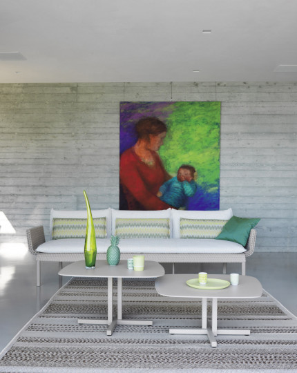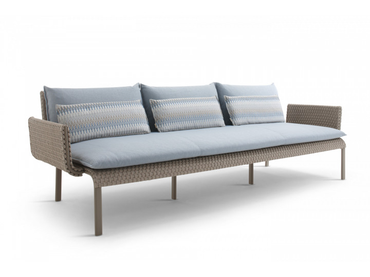 Divano in acciaio 304 verniciato a polveri, intrecciato con Flat Trendyrope. Un divano accogliente, dove la particolare geometria dello schienale si coniuga perfettamente al desiderio di comfort,  creando un angolo per vivere momenti di relax. Ottimo per arredare terrazzi e patio, dona forte personalità anche alle zone living interne. Ideale per arredamenti residenziali e contract.