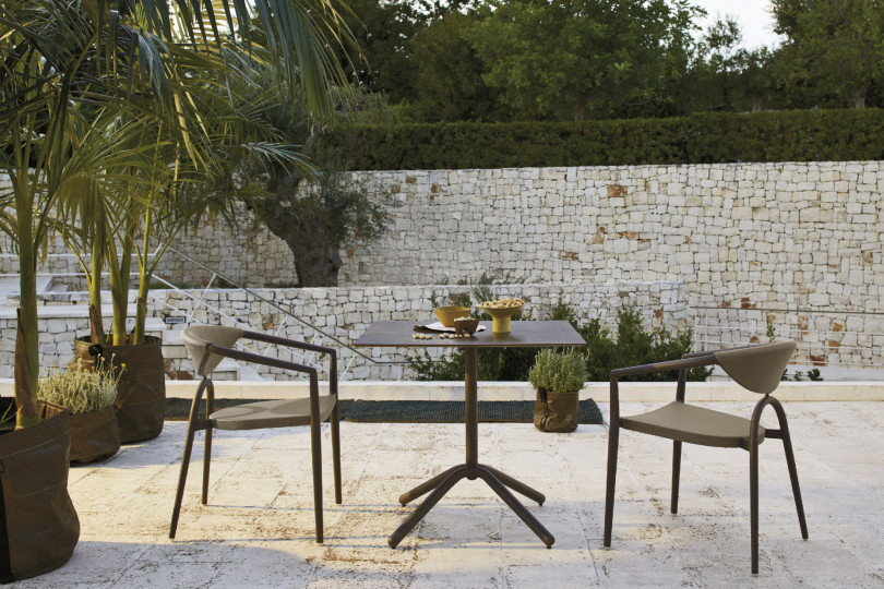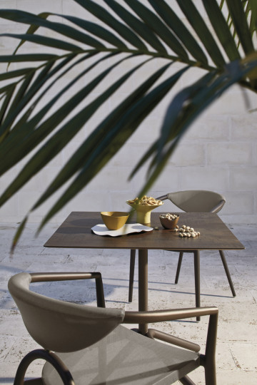Pouf in alluminio verniciato a polveri, intrecciato con Round Searope. Pratico e dal gusto finemente classico, perfetto per accompagnare la poltrona coordinata. Adatto per interno e per esterno, sia in contesti residenziali che contract.