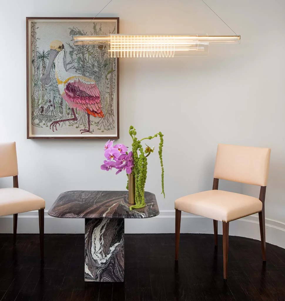 The stately silhouette of The Lion is reminiscent of a traditional Louis XIV dining chair and modernized through clean lines and pared-down details. Its thronelike stature is sculpted with an upright frame, while its delicate legs and natural leather upholstery add a hint of glamour.