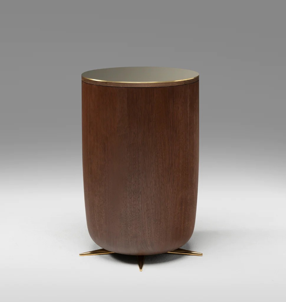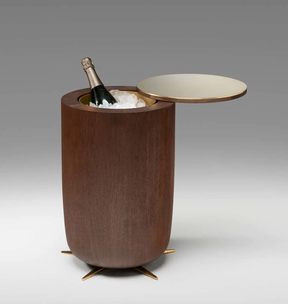The Tom holds a secret. An unassuming side table at first glance, Tom's secret is revealed as the top swivels to show a champagne bucket ready for the ceremony of popping a cork and sharing a glass.