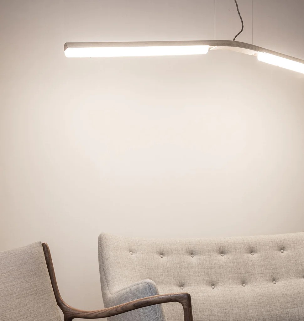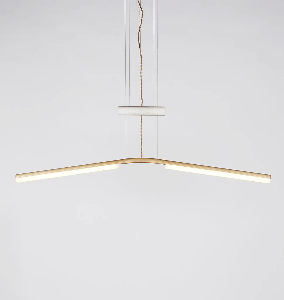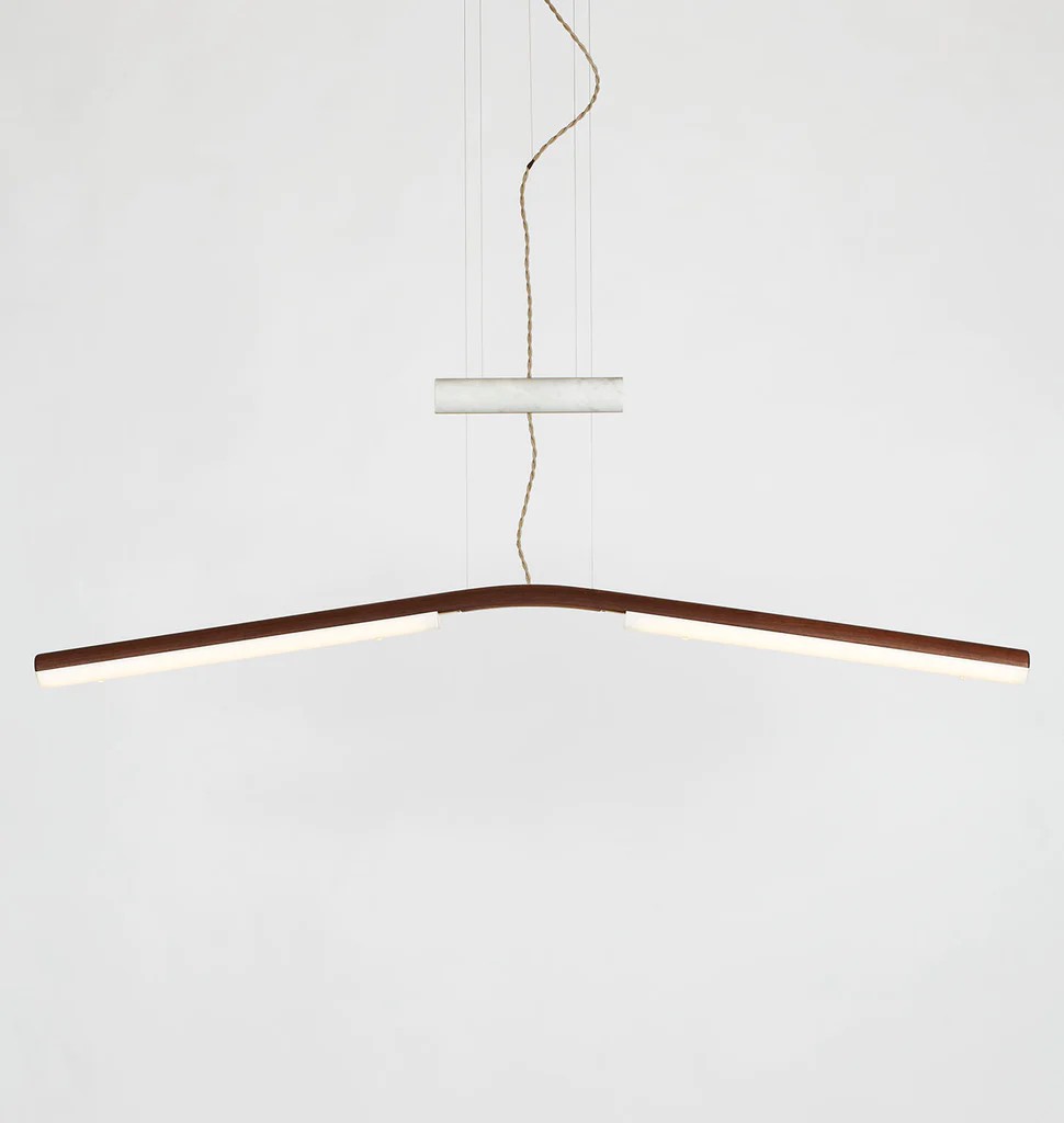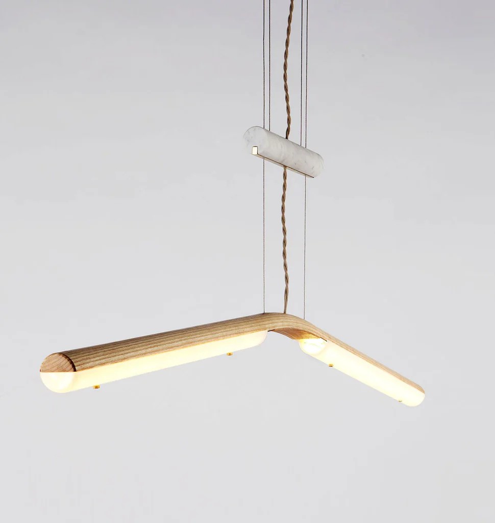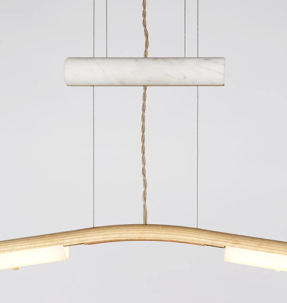 Counterweight is a series of LED fixtures made of gently arching, steam-bent wood that uses marble and brass as ballasts. Whether acting to counterbalance the lamp of the pendant light, or fixed as the base of the sconce, the mass of the stone and metal acts as a foil to the otherwise lightweight frames.