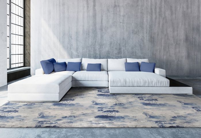 Oriente is a handmade carpet part of the Armani/Casa Rug Collection brought to you by a collaboration between Sahrai and Armani/Casa. A design inspired by the Far East, featuring trees and hills shading into clouds to create an “infinite” perspective. The stunning level of detail is achieved by using a complex production process, which requires frequent changes of fibers in different colors while handknotting: the result is a carpet showing thousands of shades and hues, recalling a sort of watercolour effect. The carpet is hand-knotted without any child labour in:100% natural Silk