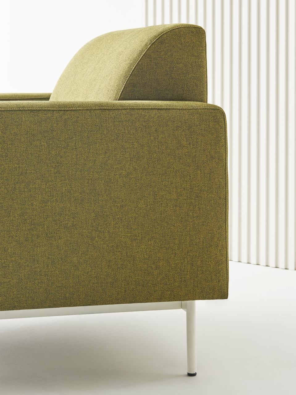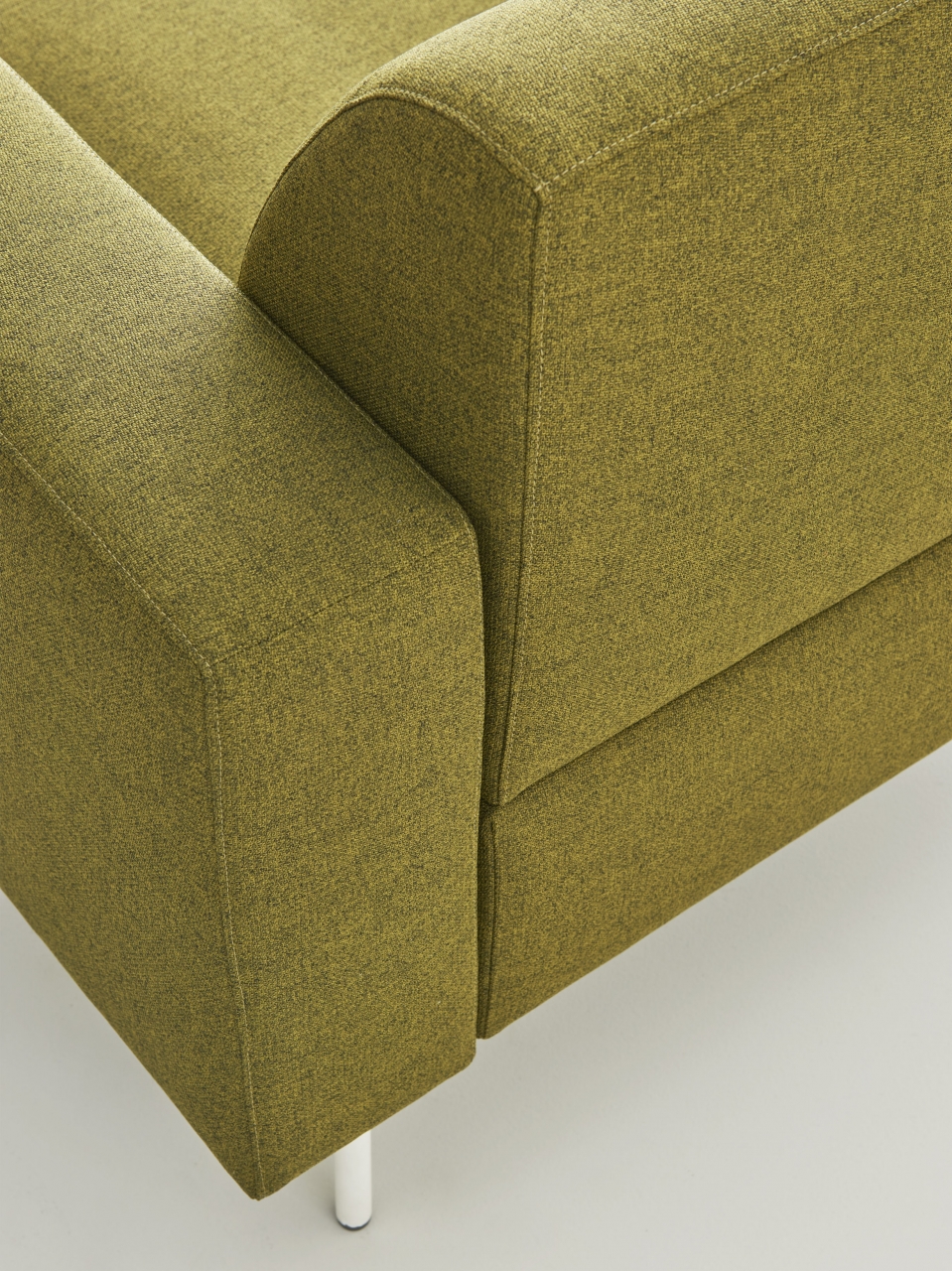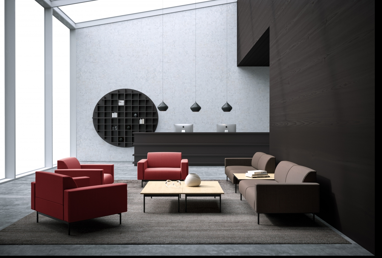 The collection includes two and three seater sofas plus an armchair; armrest options include an upholstered armrest in two sizes and a tablet arm for computer or other support. Joining tables between the seats or multifunctional tables complete the collecti