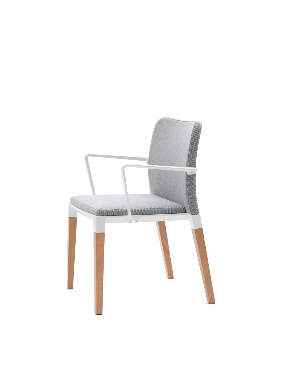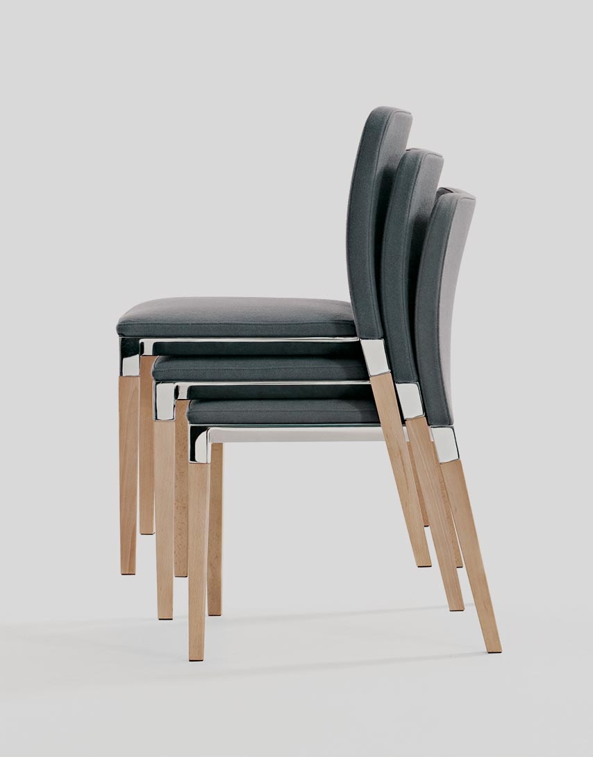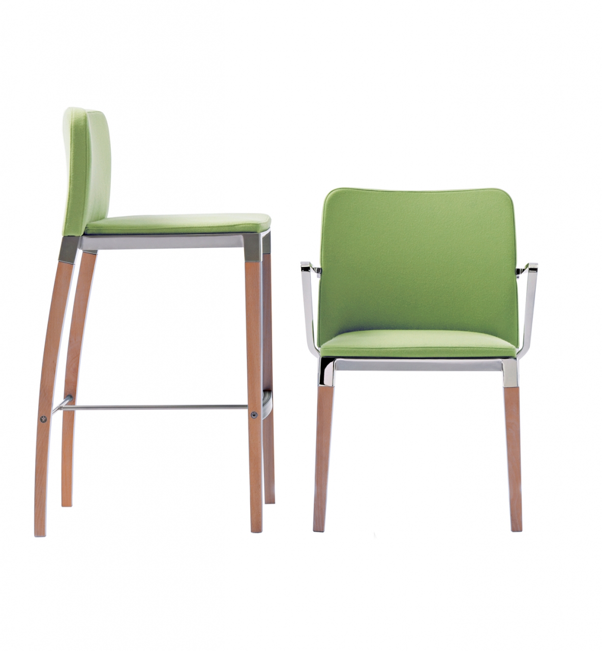 Zenith brings a classy unique combination of materials: seat frame and armrests made of die-cast aluminum, legs in wood, upholstered seat and back. Stacking chair, armchair or nonstacking stools are available in chrome or powder coated finish, with upholstered seat and back in a variety of materials. It is perfect for many environments, from the hotel room, to the restaurant, to the meeting room and office.