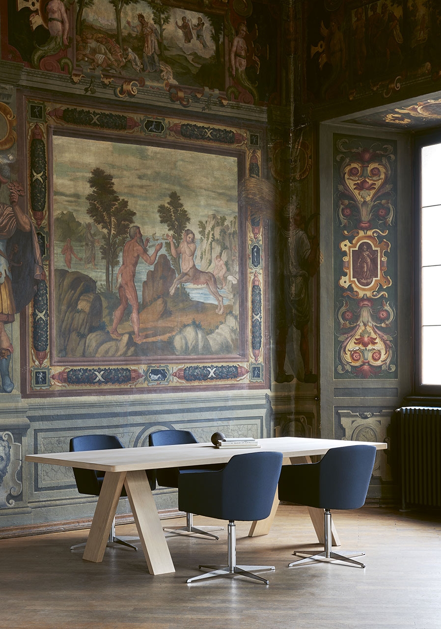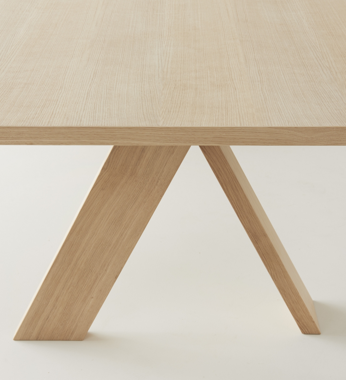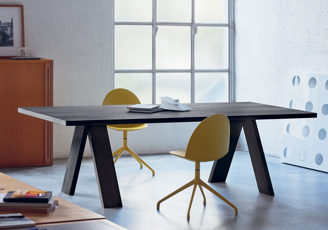 Table with essential and rigorous lines stands out for its original legs composition. These are arranged perpendicularly as well as at an angle, suggesting a circularity that amplifies the overall lightness of the piece. Solid oak available in natural or black aniline stain, Artful is perfect for both corporate meeting spaces and residential living areas.
