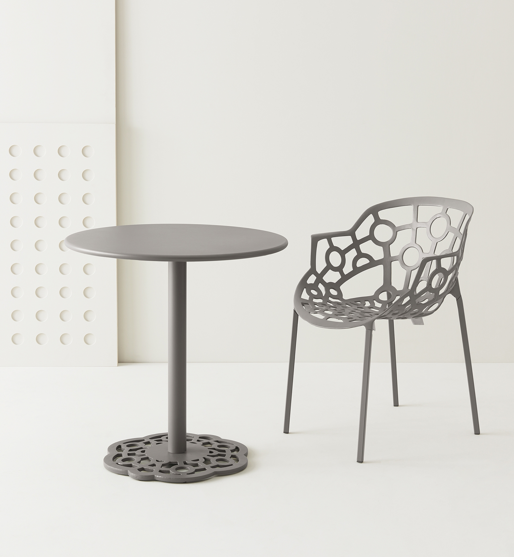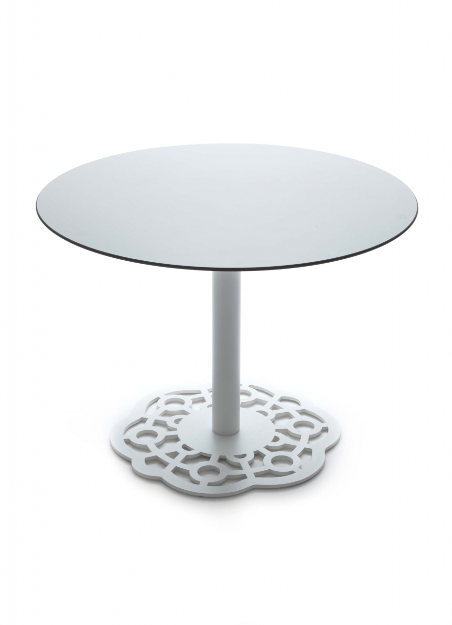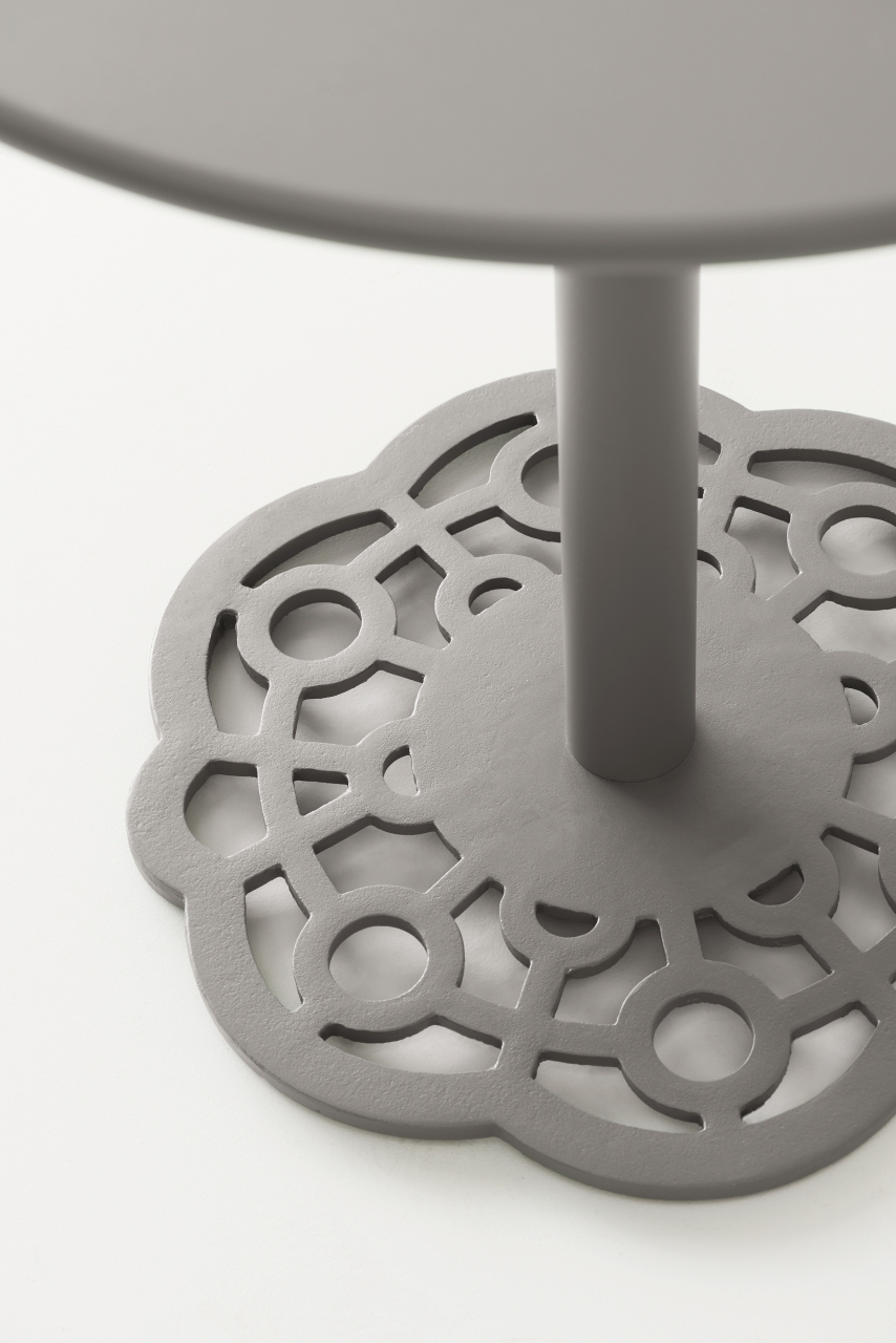 The Polo table, available in two different sizes, coordinates with the Polo chair; both have the same decorative motifs reminiscent of ancient laces. Aluminium column and cast-iron base guarantee absolute stability. Perfect for outdoor environments.