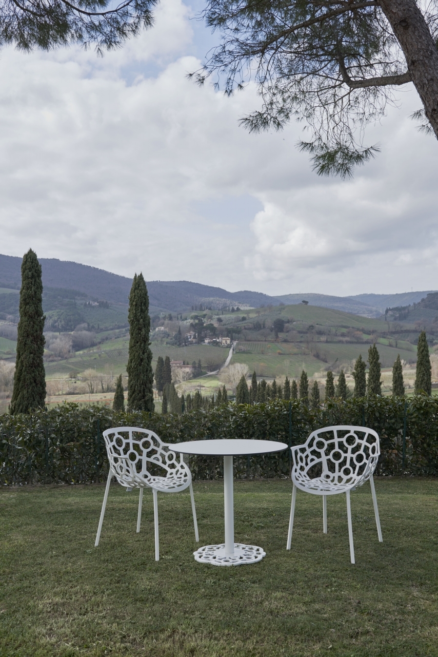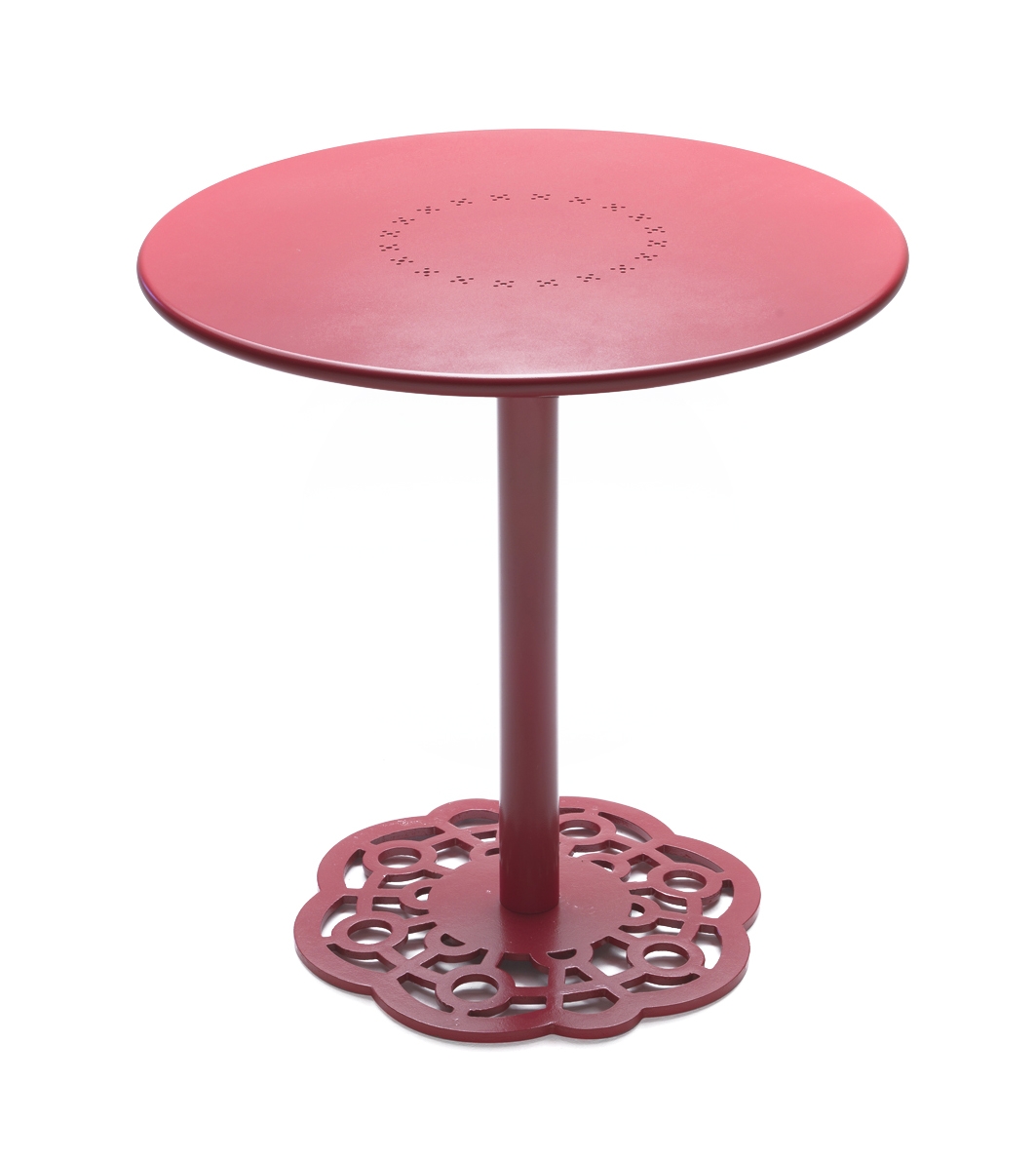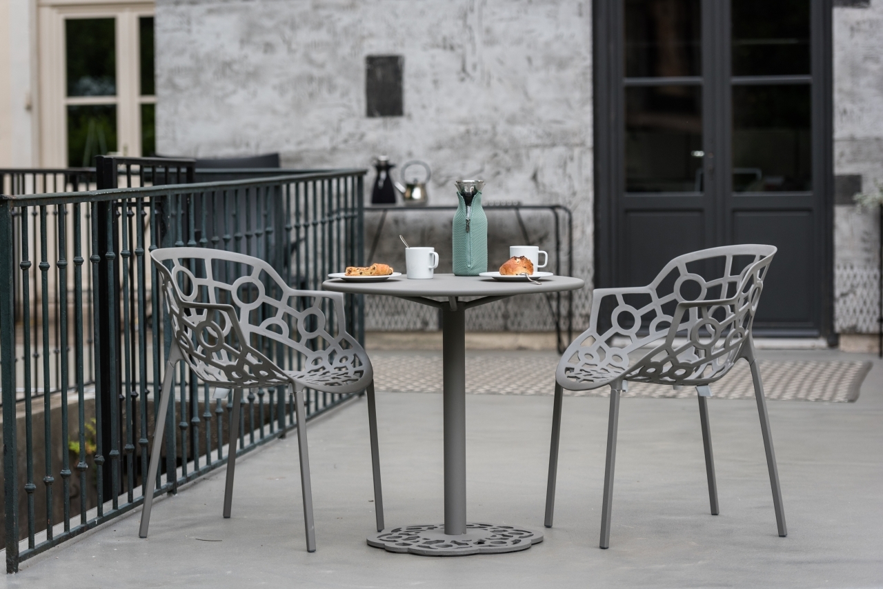 The Polo table, available in two different sizes, coordinates with the Polo chair; both have the same decorative motifs reminiscent of ancient laces. Aluminium column and cast-iron base guarantee absolute stability. Perfect for outdoor environments.