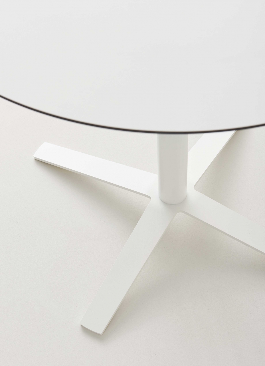 A simple hand, witness to an ancient culture, reveals itself in primary geometrics that are as minimal as they are recognizable. The upright steel column rests against the crossed strips at the table’s base. These work in combination with plywood tabletops, laminated MDF or HPL to accommodate a variety of needs.