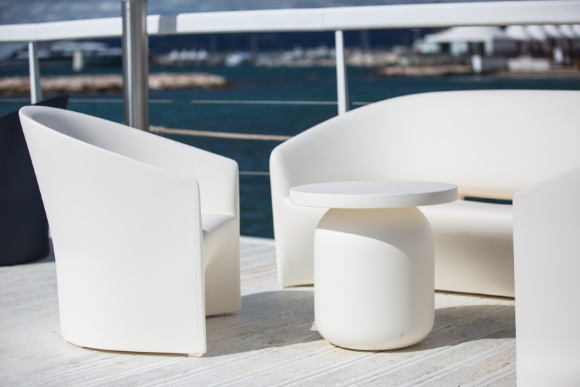 The Pine Beach line is inspired on the seashore, with its soft, rounded shapes. A rounded, embracing armchair that follows the human body's er-gonomic shape, with a soft and futuristic line. Complete with sofa and armchair, suitable for indoor or outdoor areas. Thanks to their draining system, with a small drain hole for water, it is possible to sit on these pieces even after heavy rain.