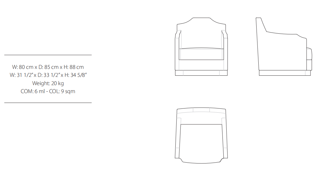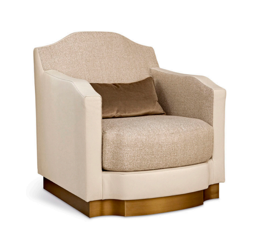 Armchair, frame made of solid timber and plywood. Variable densities polyurethane foam padding. Mixed down feather back rest pillow. Antique bronze or antique silver skirting