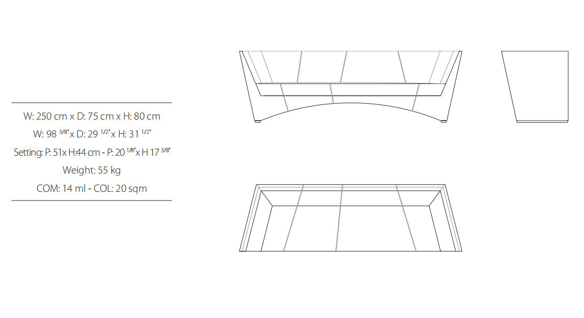 Sofa, frame made of solid timber and plywood. Variable densities polyurethane foam padding. Polished stainless steel feet. 50x50 cm and 50x25 cm mixed duck feather pillows recommended (refer to pillow section).