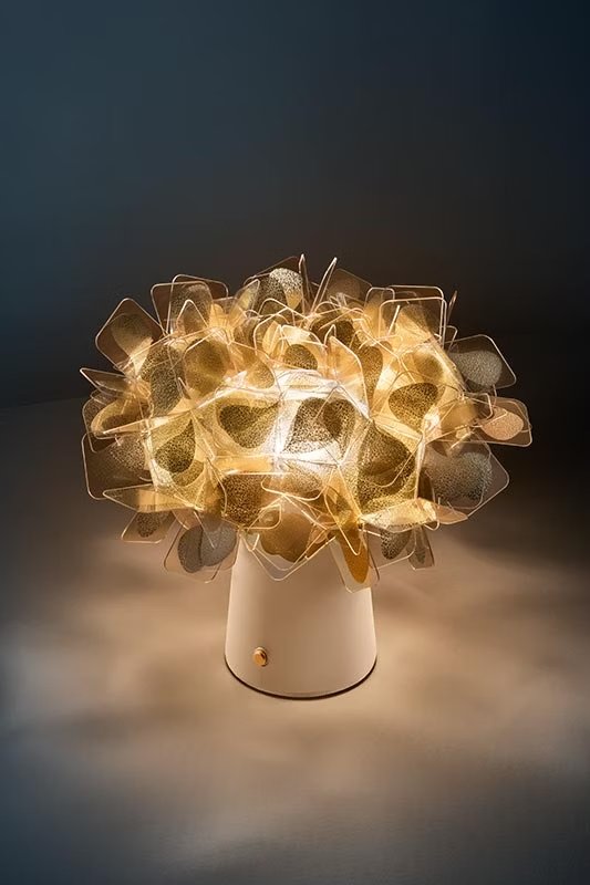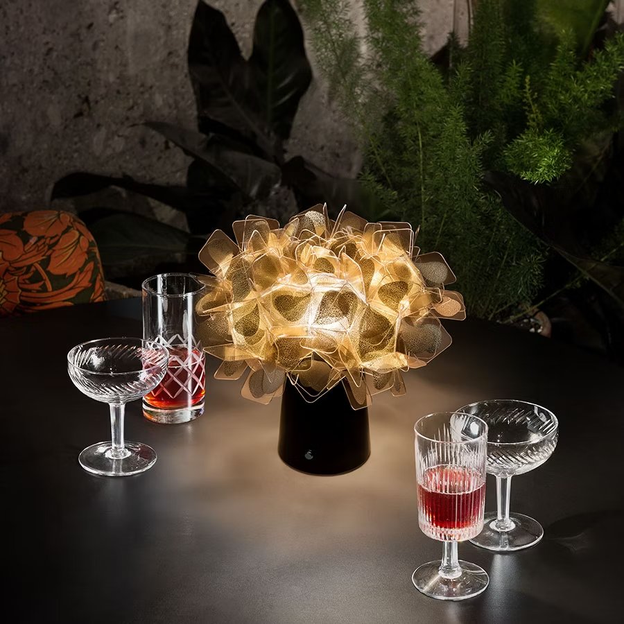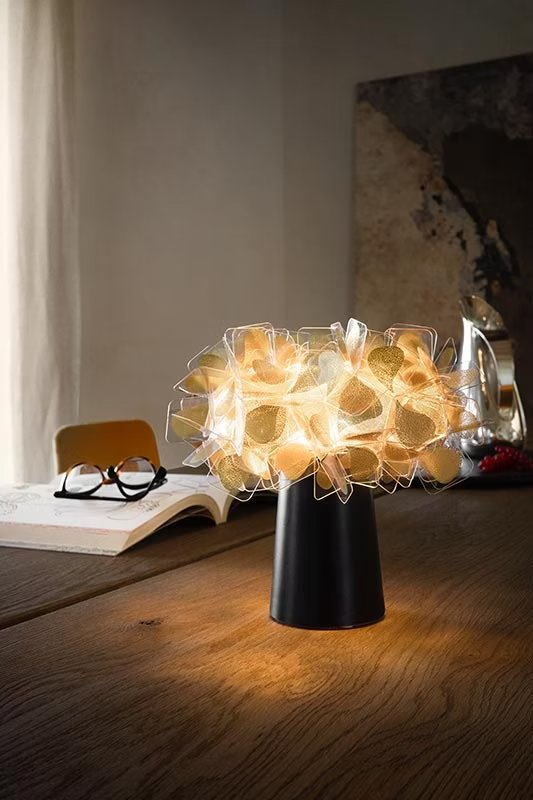 This table lamp inspired by nature is wireless and fully rechargeable, effortlessly moving from place to place, inside to outdoors. A bouquet for al fresco dinners, a glow by the bath, a welcome to another new day, or the perfect centerpiece for a table that exudes unique elegance. A dimmable LED system lasting up to 60 hours can be tailored to every place and every occasion. For Clizia’s first decade, Mama Non Mama shines in a powerful, luxurious combination of black and gold, with a contrasting matte base.