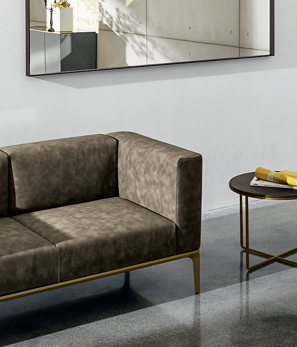 Divano componibile e personalizzabile con gambe in alluminio pressofuso cromato o verniciato, varie finiture, e struttura con profilo in alluminio anodizzato o verniciato, varie finiture. Seduta e braccioli imbottiti e rivestiti in vari materiali e finiture.