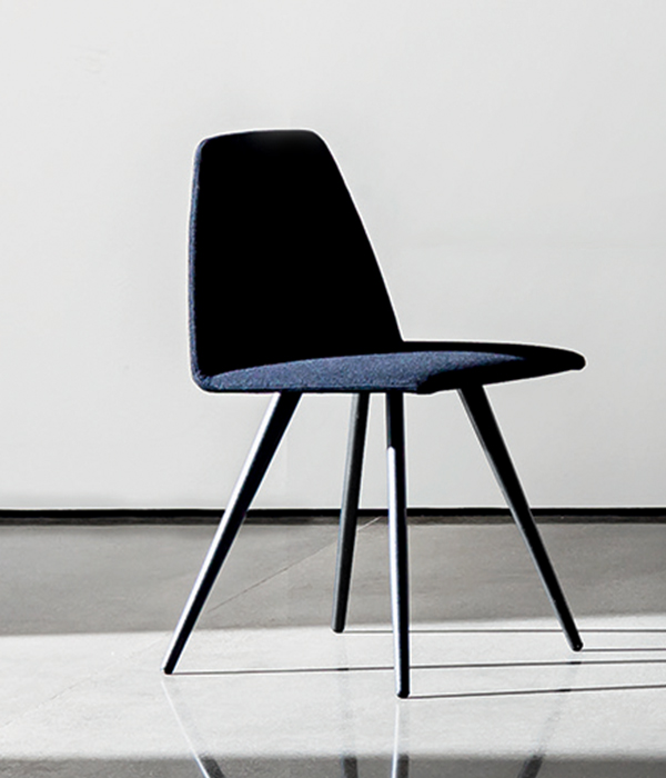 Sedia con basamento in metallo goffrato nero. Disponibile con scocca di eucalipto naturale o tinto, con o senza cuscino, oppure, nella versione completamente rivestita in pelle o tessuto Kvadrat.