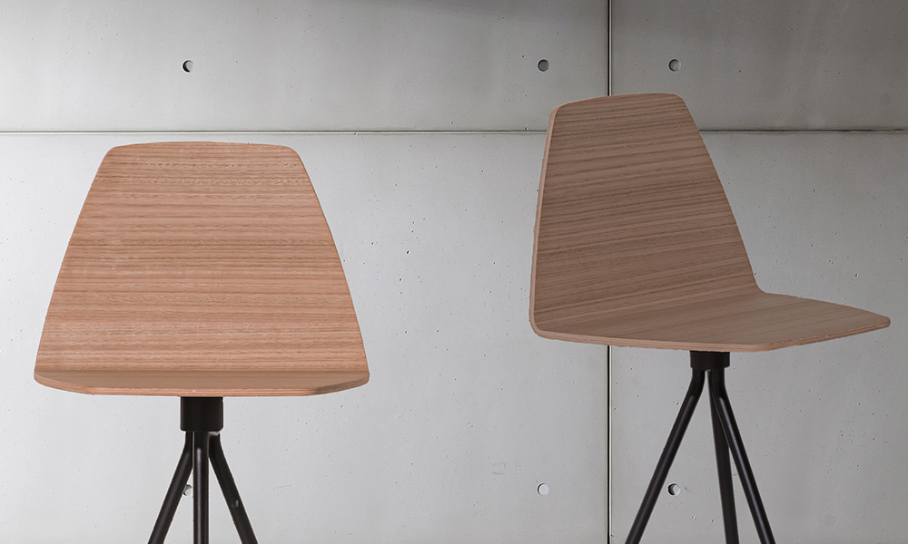 Sgabello con monoscocca in multistrato di legno disponibile nelle finiture: noce Canaletto, rovere naturale o tinto wengé. Gambe in metallo verniciato goffrato, varie finiture.
