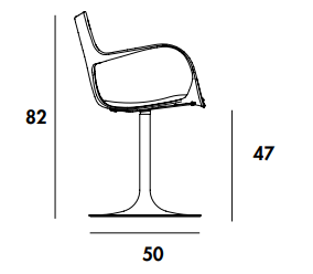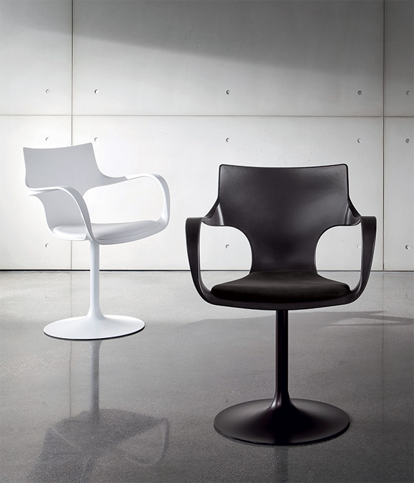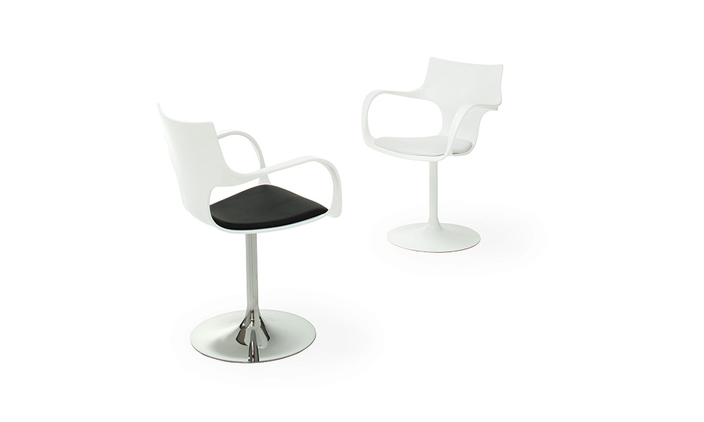 Sedia girevole con braccioli. Struttura in metallo cromato o laccato bianco o nero.