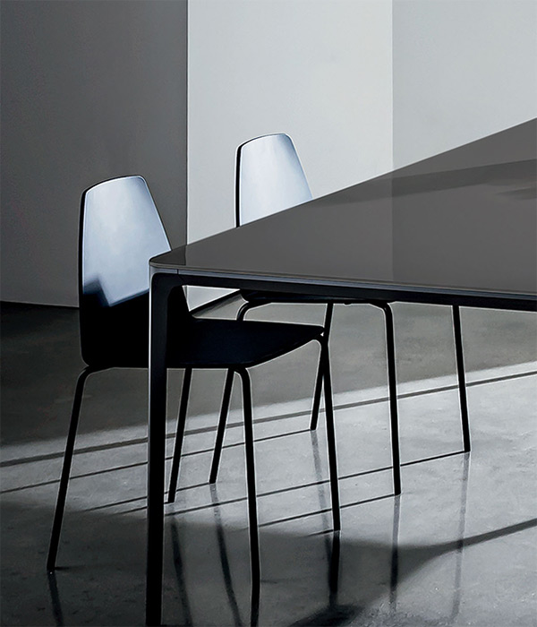 Sedia impilabile con basamento in metallo goffrato nero, creta o caffé. Disponibile con scocca di eucalipto naturale o tinto, con o senza cuscino, oppure nella versione completamente rivestita in pelle o tessuto Kvadrat.