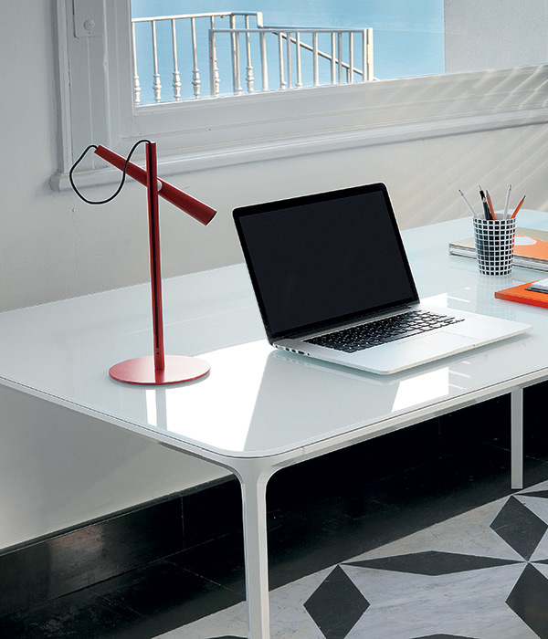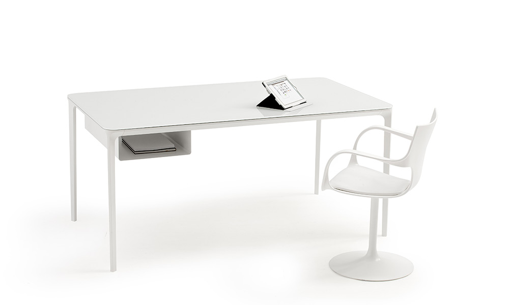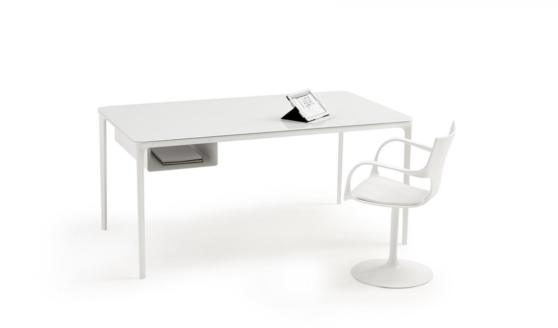 Tavolo con gambe in alluminio pressofuso cromato o verniciato, varie finiture, e struttura con profilo in alluminio anodizzato o verniciato, varie finiture. Piano in vetro temperato sp. 8 mm laccato o acidato laccato, vari colori. Disponibile anche nelle versioni con top in legno, ceramica o hpl, varie finiture. Accessorio portadocumenti in alluminio laccato, vari colori.