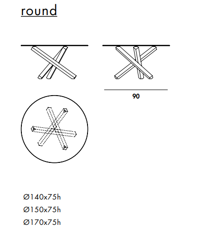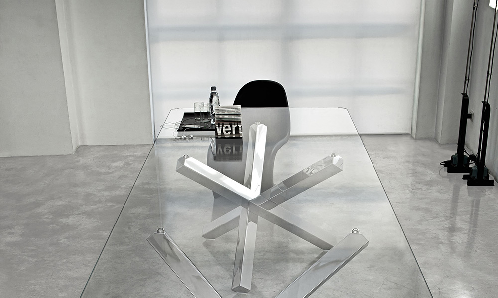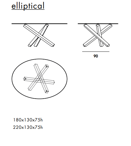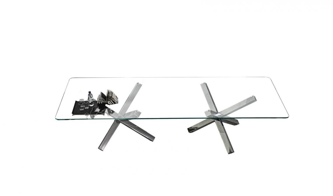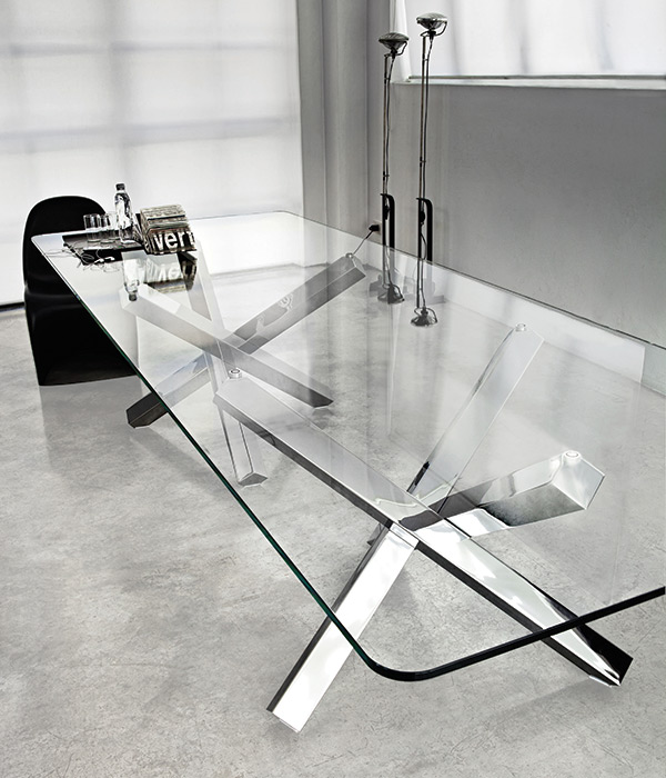 Tavolo con basi in legno, varie finiture, o in metallo cromato lucido, laccato o brunito. Top in vetro temperato trasparente extrachiaro, vari colori. Nella versione con top fumé il vetro è stratificato 8+8 mm.