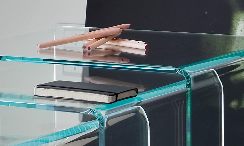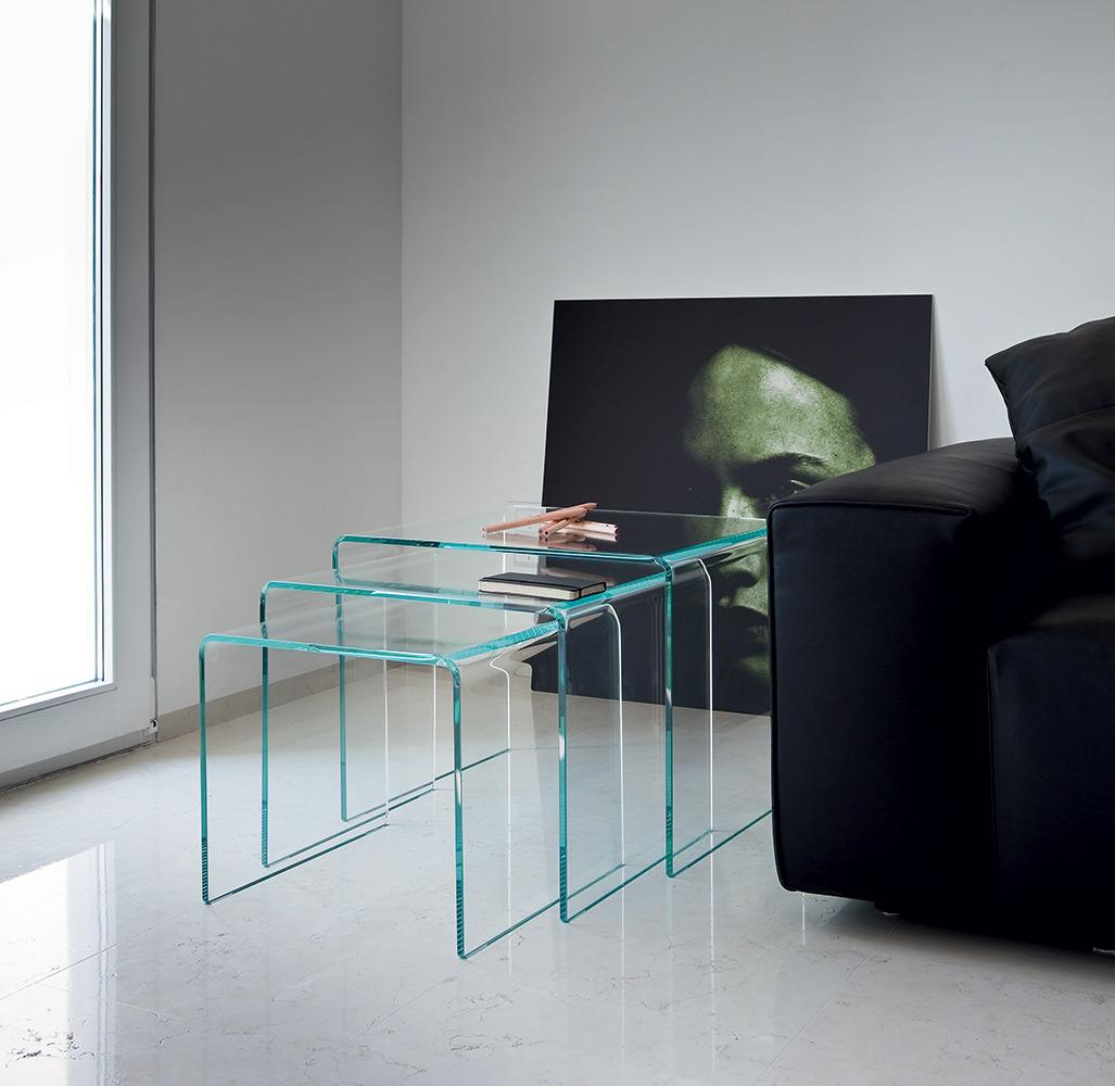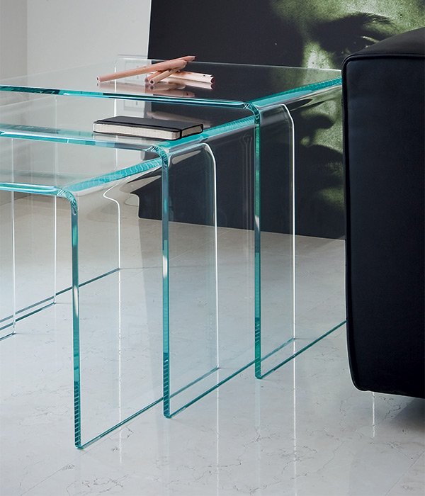 Tavolino in vetro curvo trasparente extrachiaro, laccato mono o bicolore. Disponibile anche nella versione con vetro fumé.