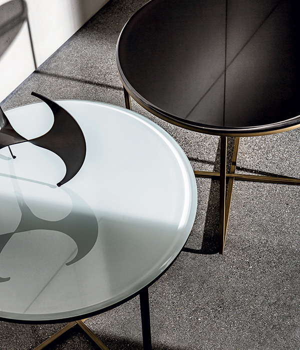 Tavolino rotondo con struttura in metallo laccato nelle finiture ottone brunito o caffé. Top disponibile in vetro laccato o vetro materico specchiato nelle finiture bronzo o perlato.