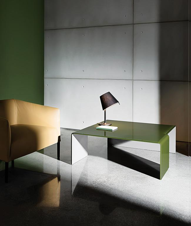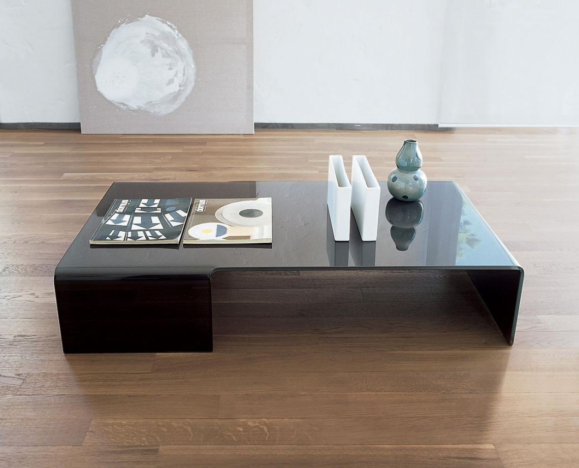 Tavolino in vetro curvo trasparente extrachiaro, fumé o laccato mono o bicolore.