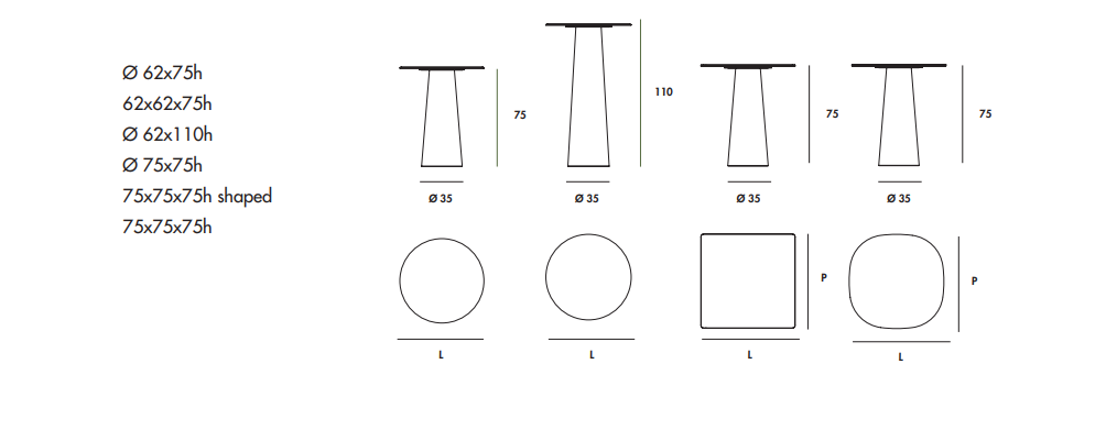 Tavolo con base in metallo cromato o laccato, varie finiture. Top in vetro temperato, MATERIA o ceramica, varie finiture.