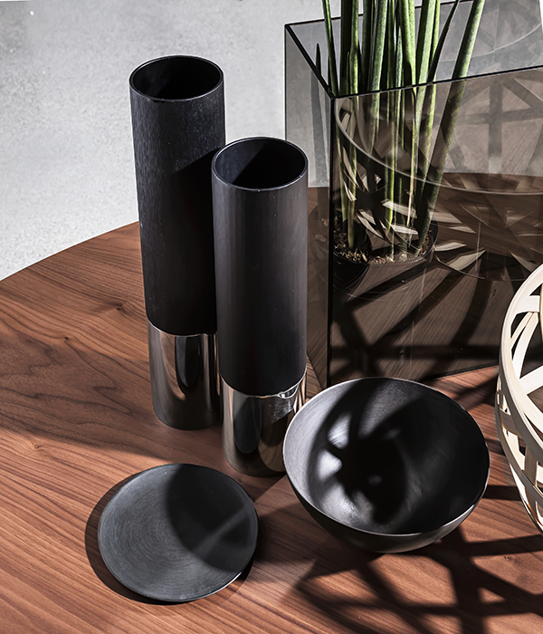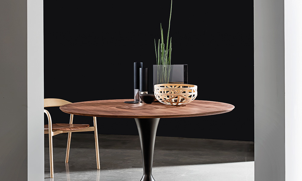Tavolo con base in metallo cromato o laccato, varie finiture. Piano in multistrato di legno di betulla finlandese spessore 26 mm, con bordo a vista tagliato a 45°, impiallacciato noce oppure rovere in finitura spazzolata.