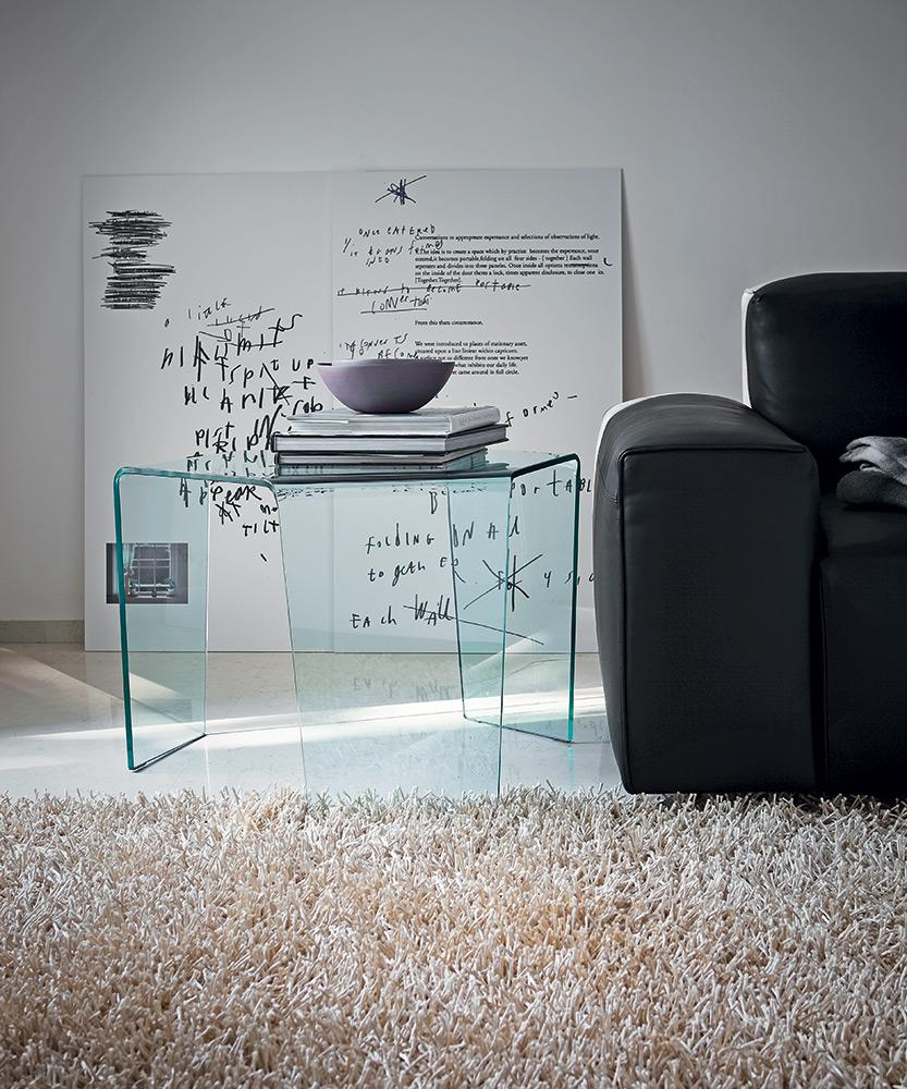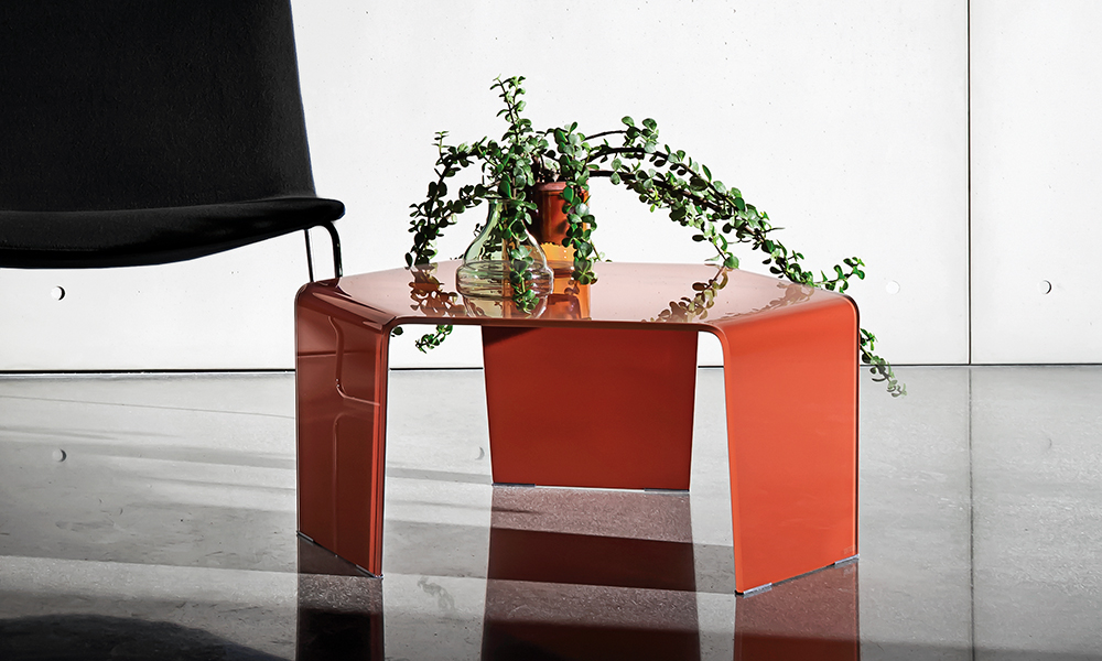 Tavolino esagonale disponibile nella versione trasparente extrachiaro, fumé o laccato mono e bicolore.