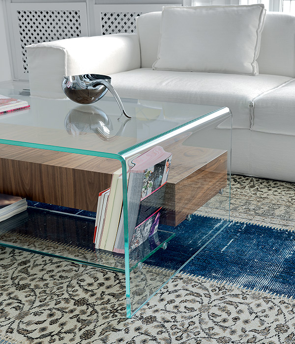 Tavolino in vetro curvato trasparente o trasparente extrachiaro con ripiano in vetro. Cassettiera in noce canaletto, bianco poro aperto o wengé.