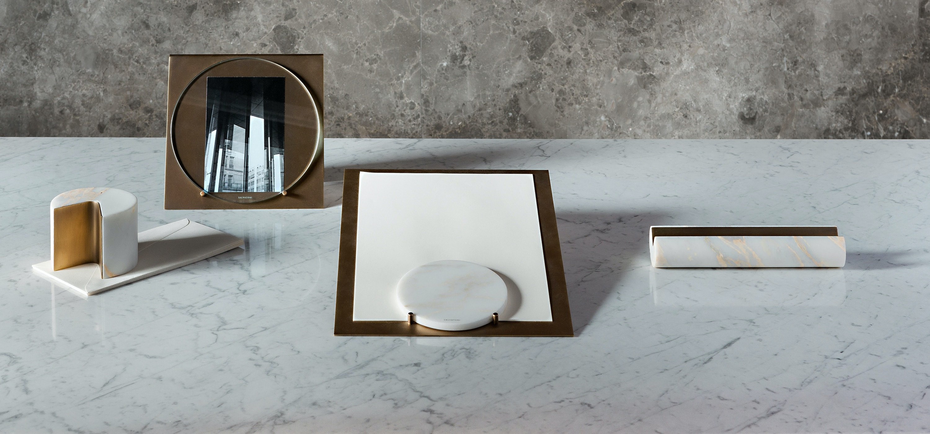 The collection combines burnished brass with Calacatta Vagli, a milky white marble accented with beautiful swathes of pale gold and grey veining.