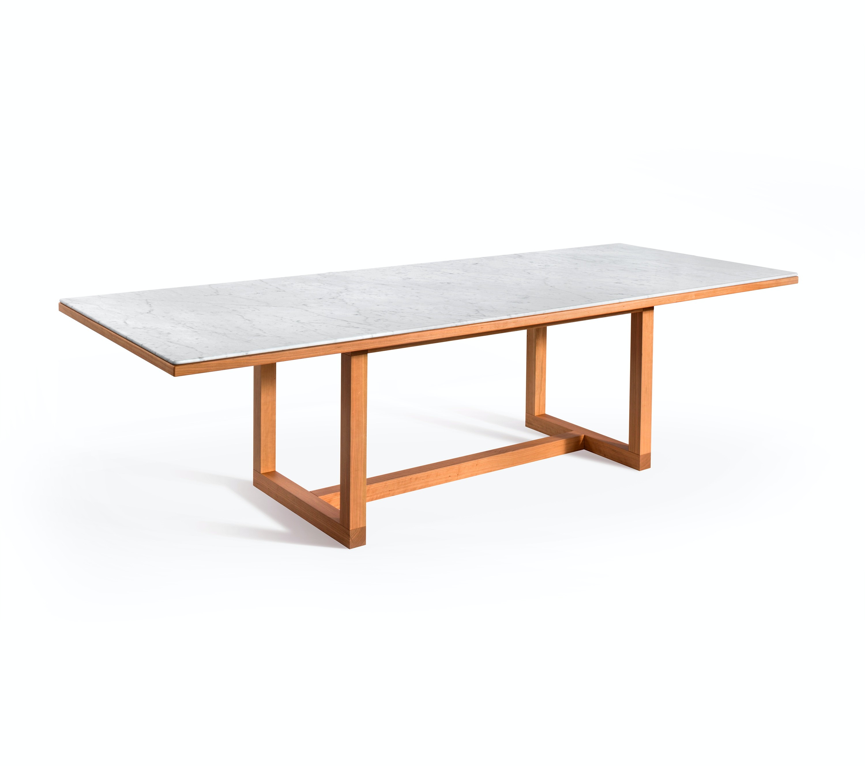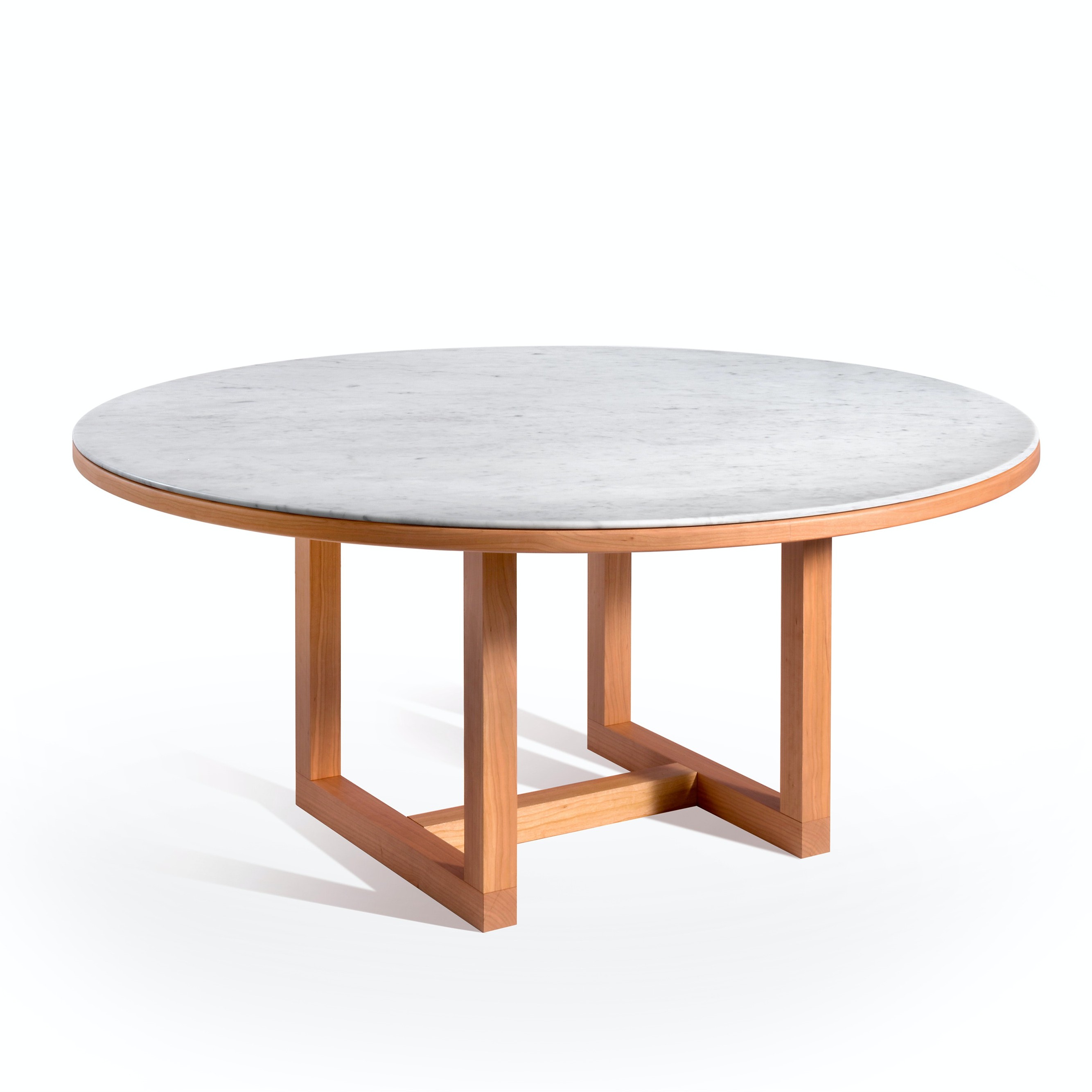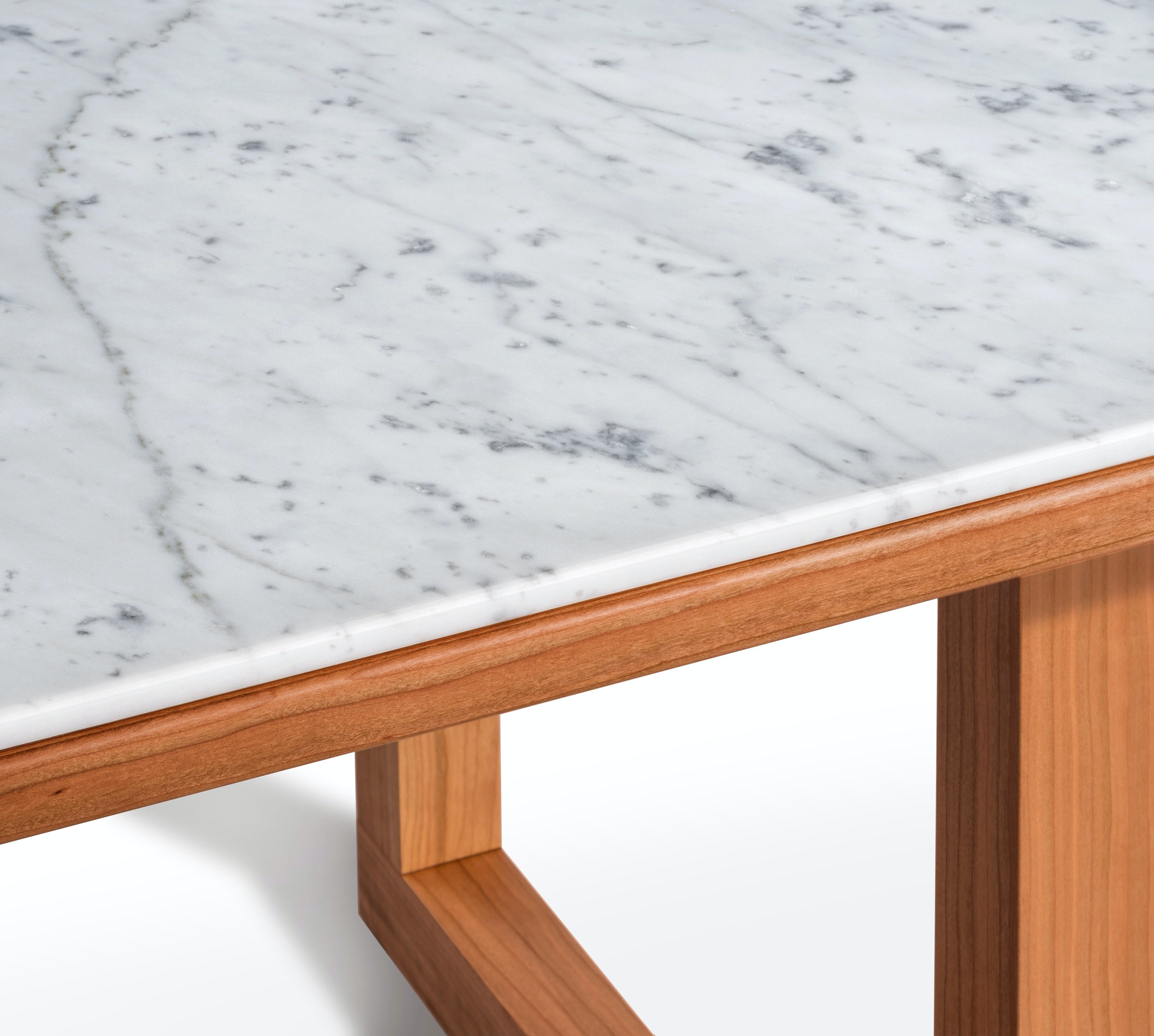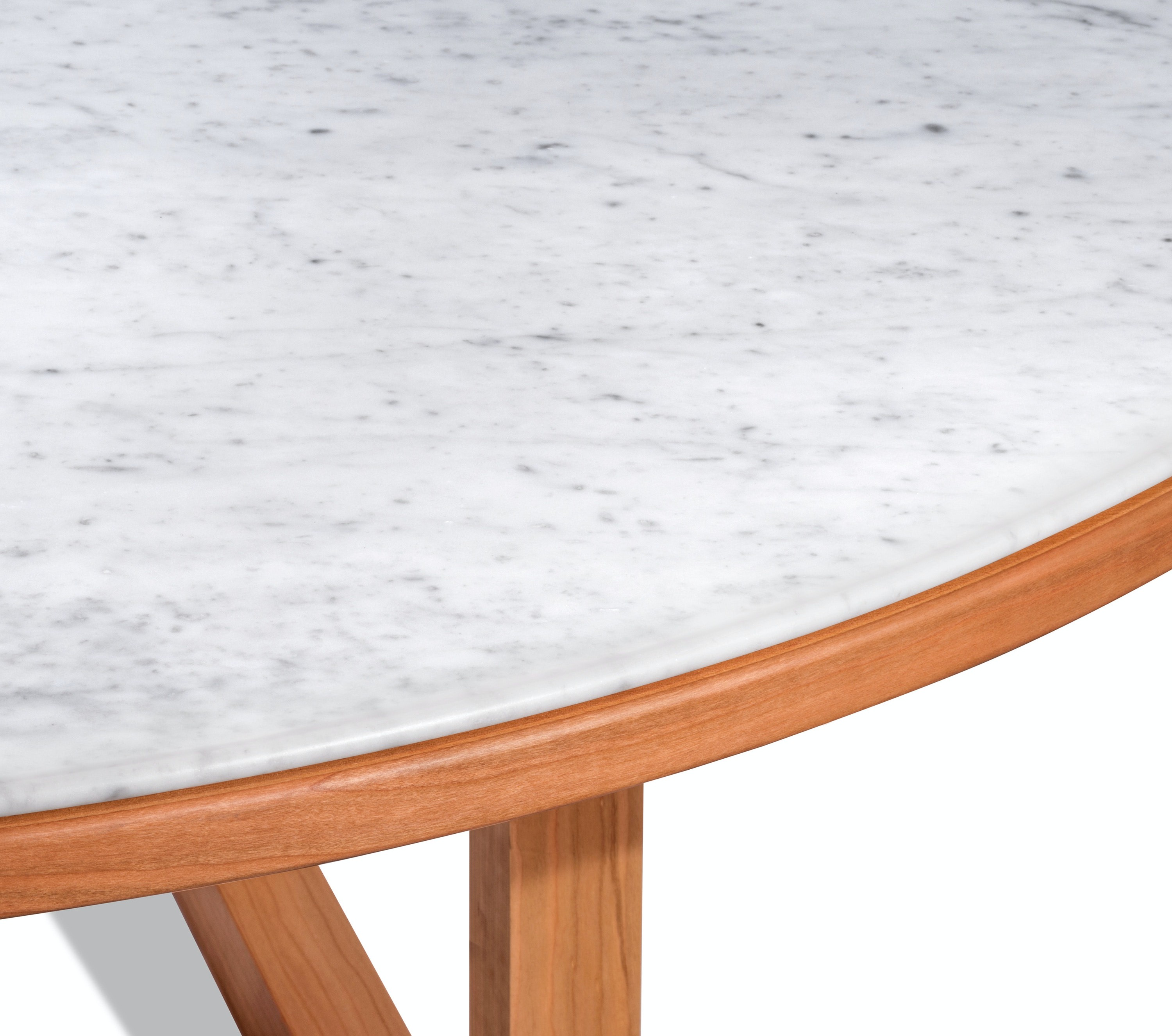Available in rectangular and circular versions, each table pairs a beautiful piece of Bianco Carrara with a cherry wood structure and features careful details such as rounded edges and a simple but thoughtfully devised frame.