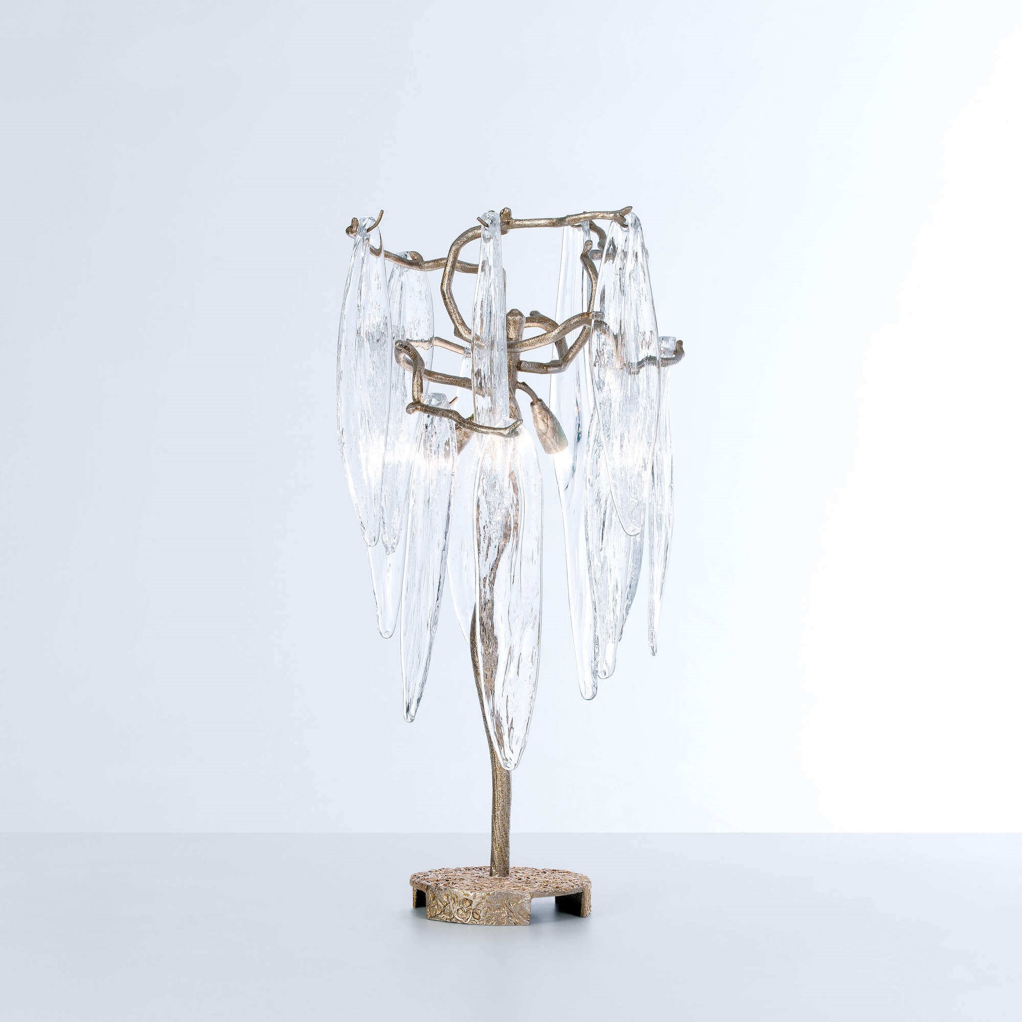 Featuring intrinsic solid verticality, the Waterfall collection plays with the duality of visually dense crystal pieces and the minimalism of the bronze structure. Impending water fractions suspended and immobilized, the glass of the Waterfall exist in an extended diversity of chromatic options, a characteristic that combined with the different bronze finishes, meets the need to combine with decoration elements of various shades in a grandiose visual presence.