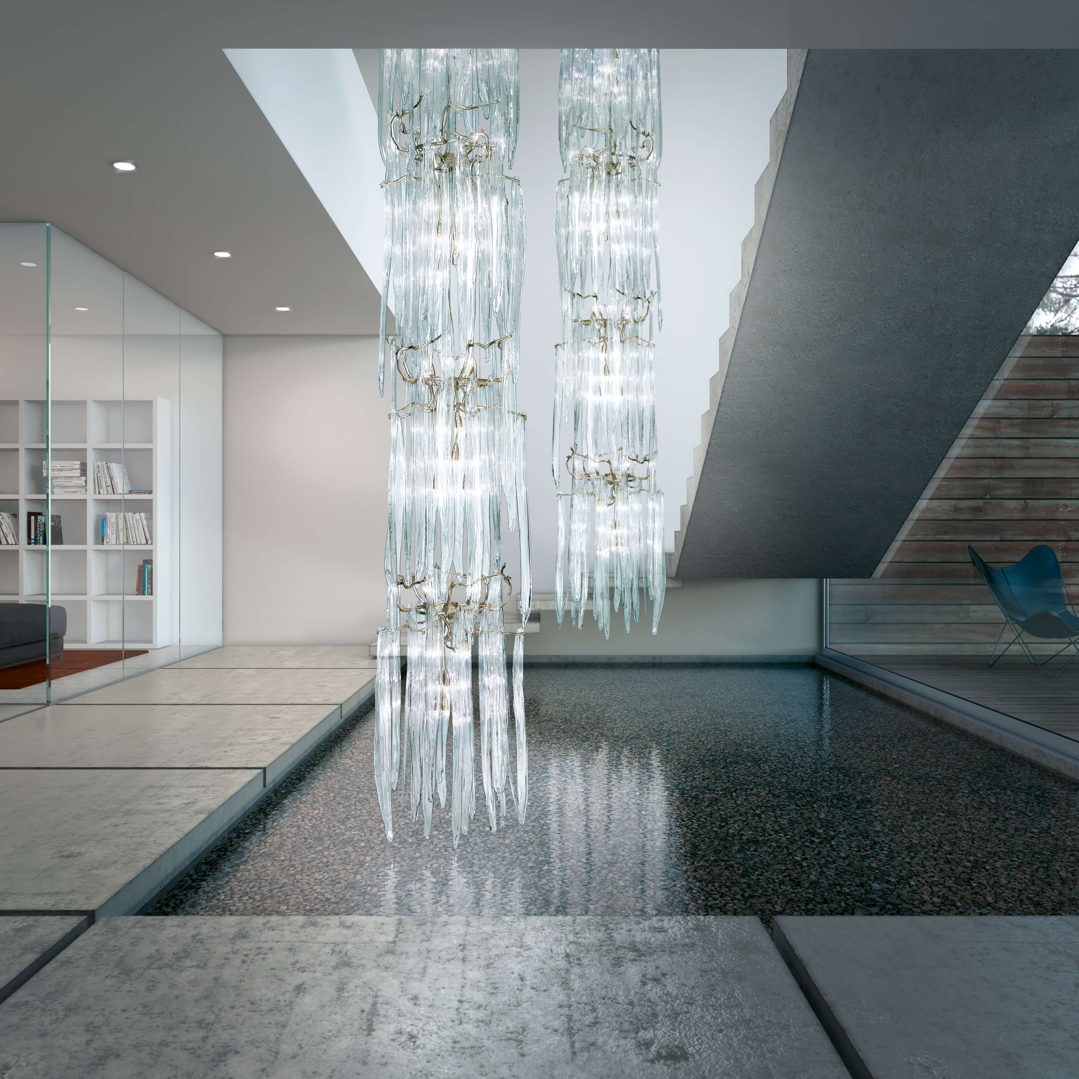Featuring intrinsic solid verticality, the Waterfall collection plays with the duality of visually dense crystal pieces and the minimalism of the bronze structure. Impending water fractions suspended and immobilized, the glass of the Waterfall exist in an extended diversity of chromatic options, a characteristic that combined with the different bronze finishes, meets the need to combine with decoration elements of various shades in a grandiose visual presence.