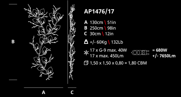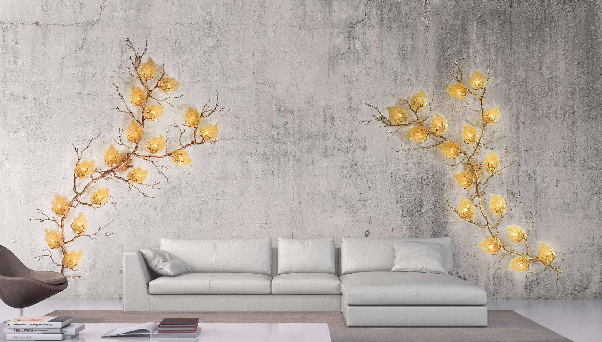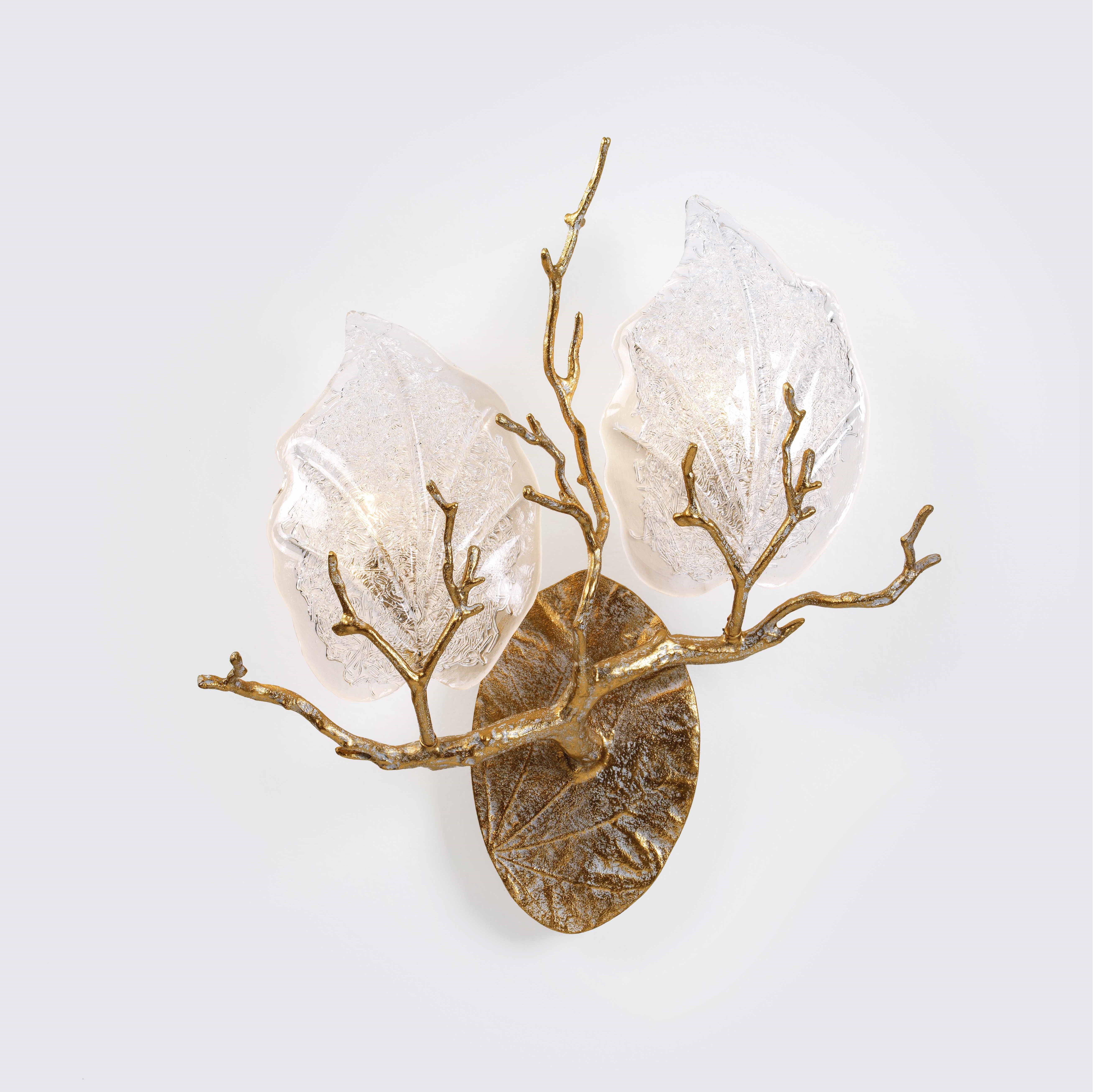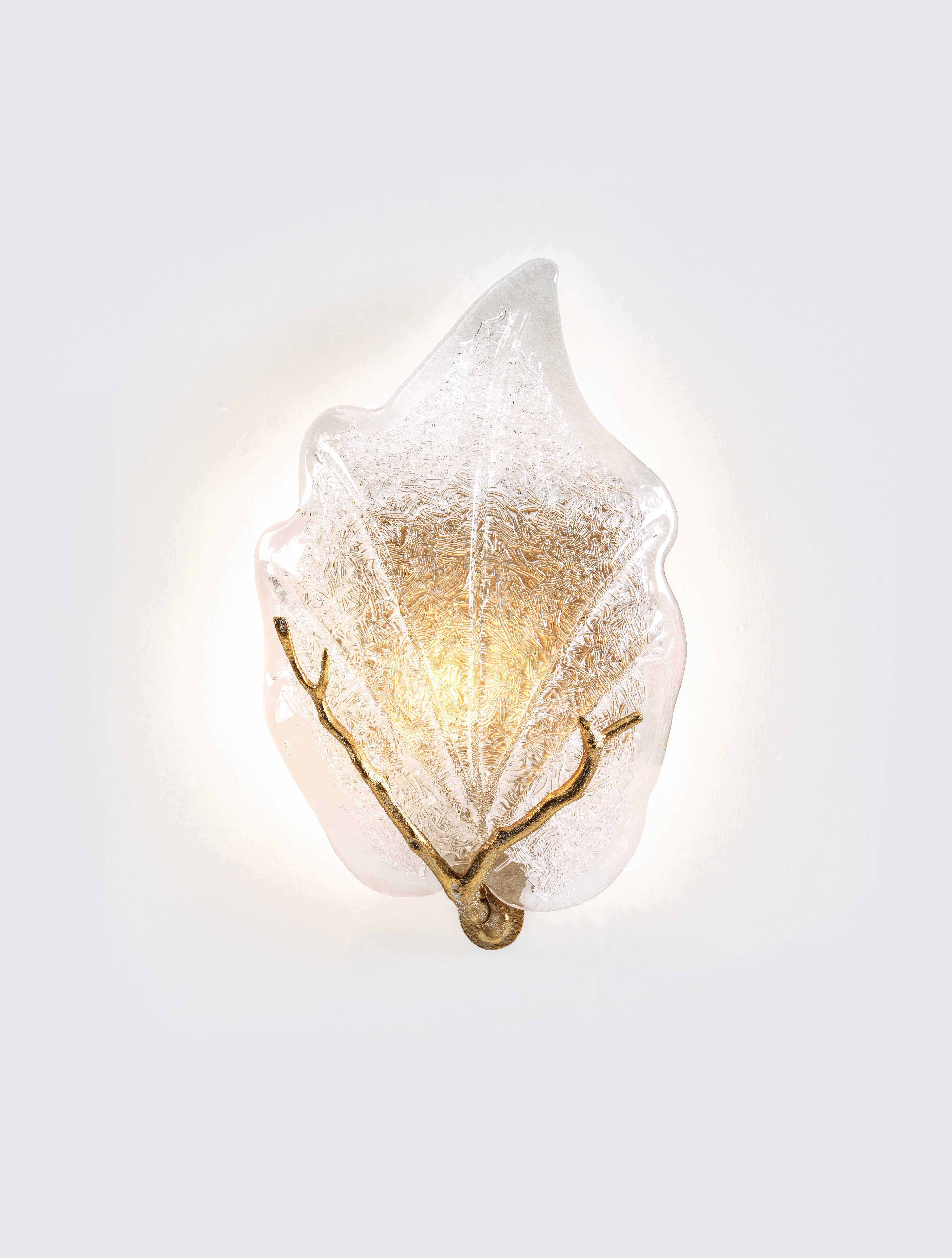 Designed with a random disposition of glass leaves that look like floating lights embraced by branches.