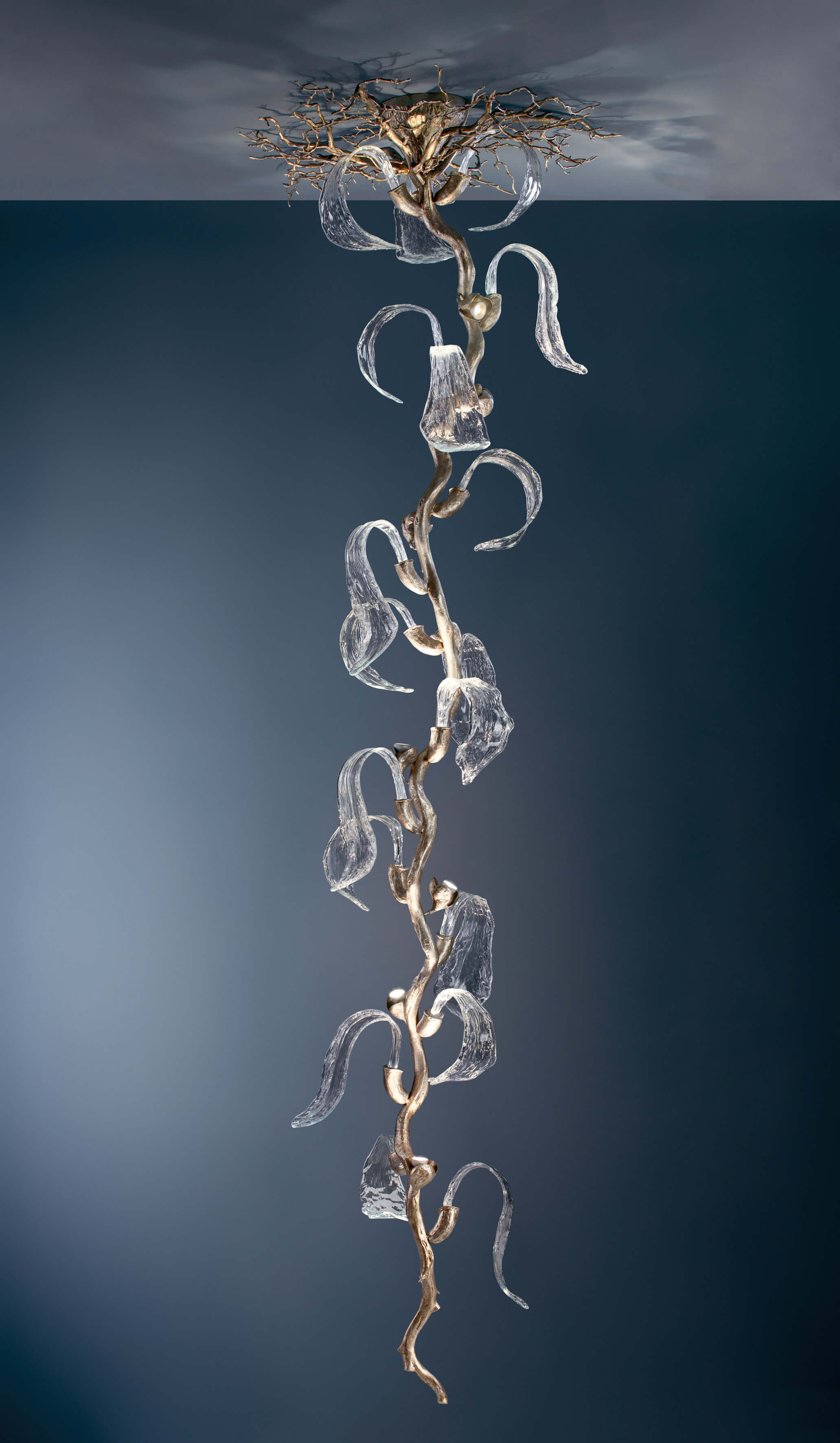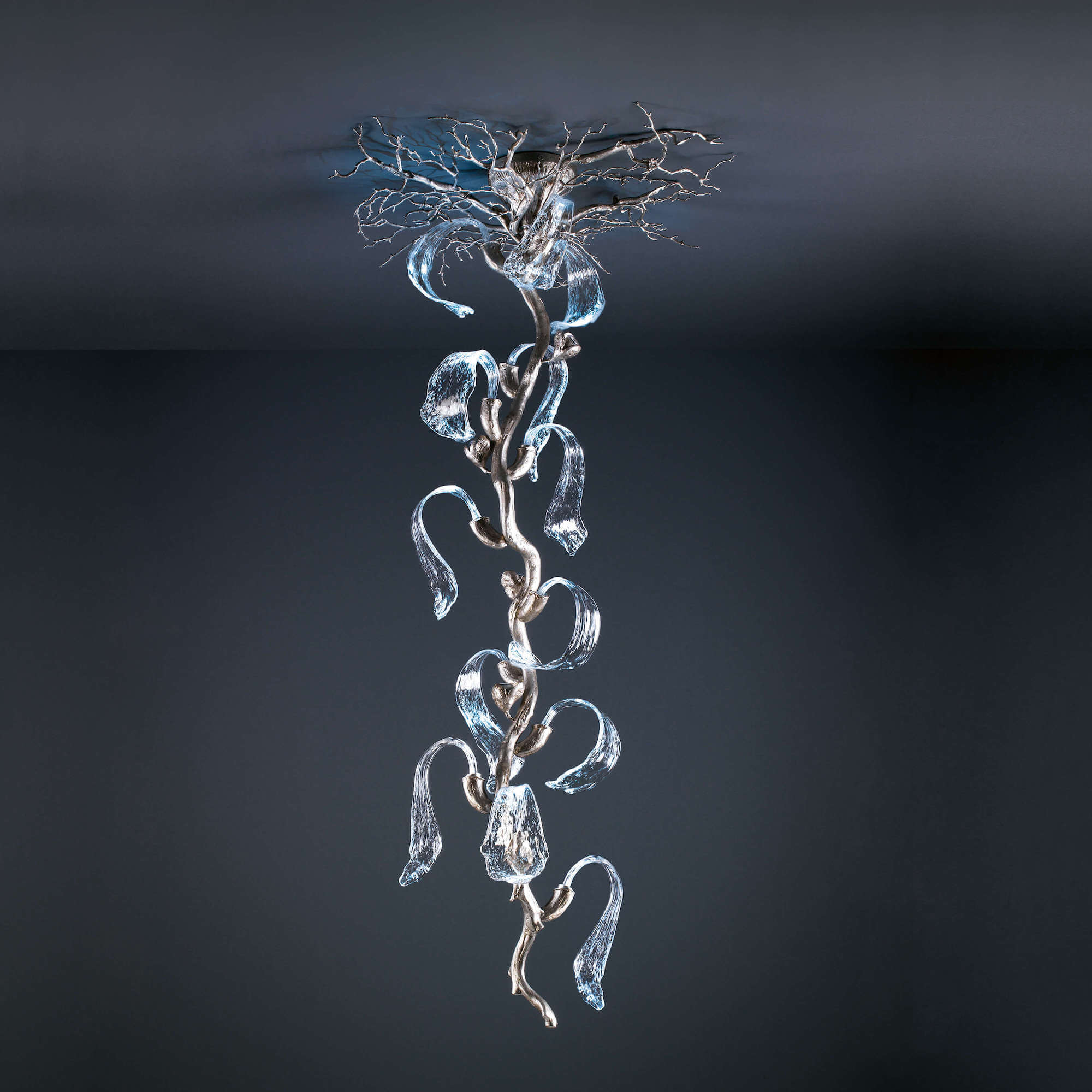 With a particular design, the Icarus collection looks as if a frozen fountain was taken directly from its natural setting. Designed like a sculpture by its close resemblance to its nature, the light emerges within the crafted glass, following the liquid motion that grows supported by the bronze central branch.