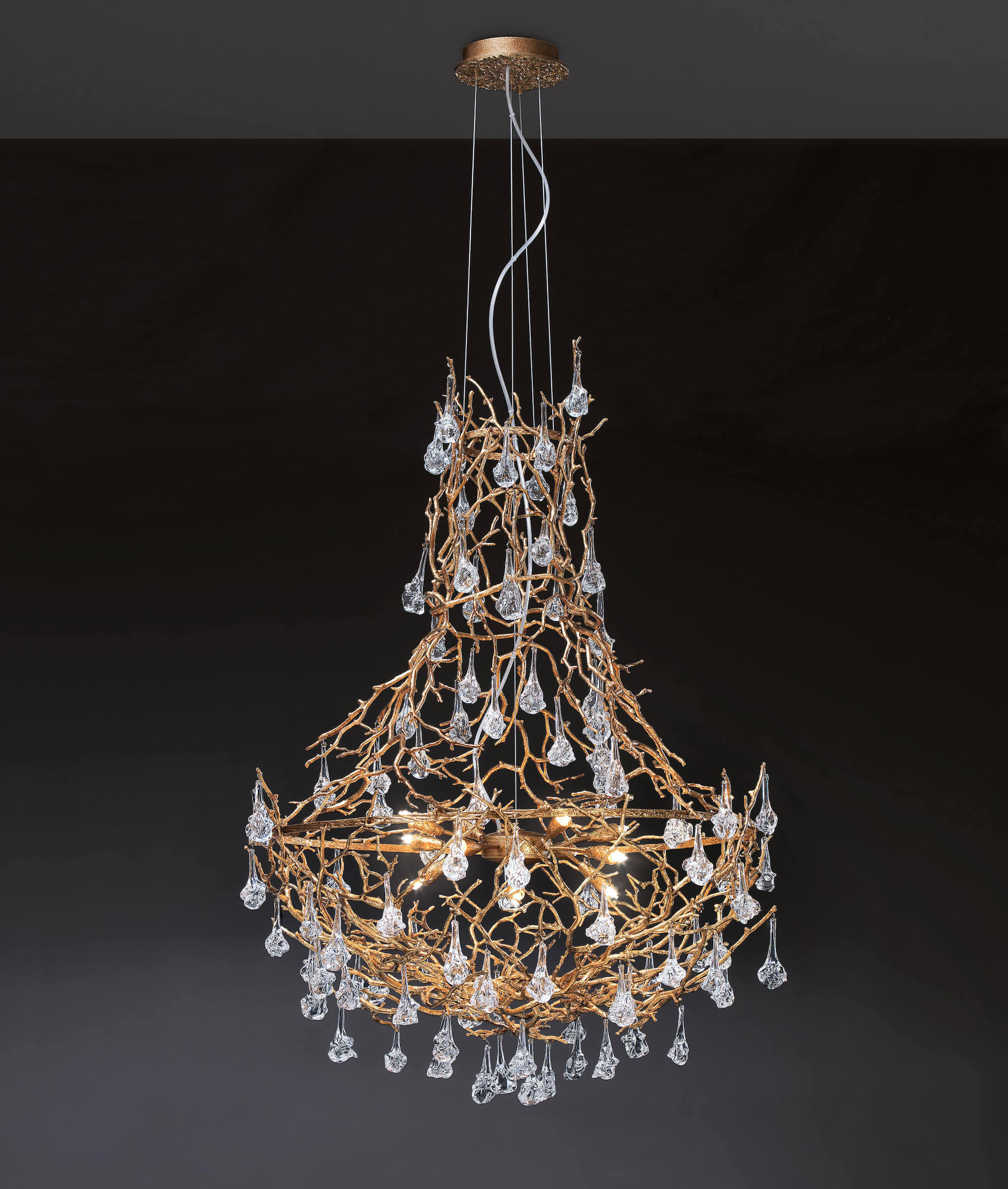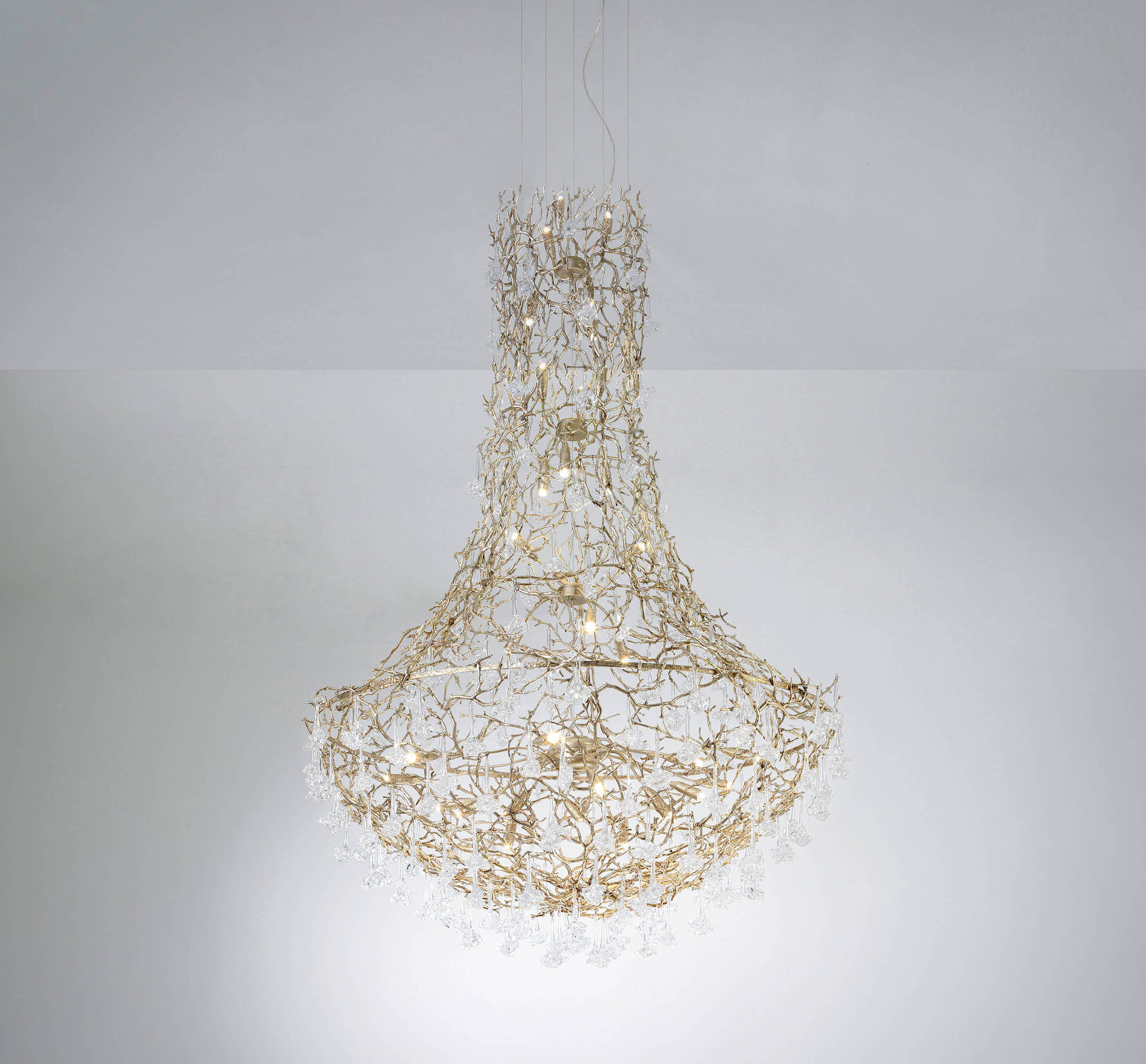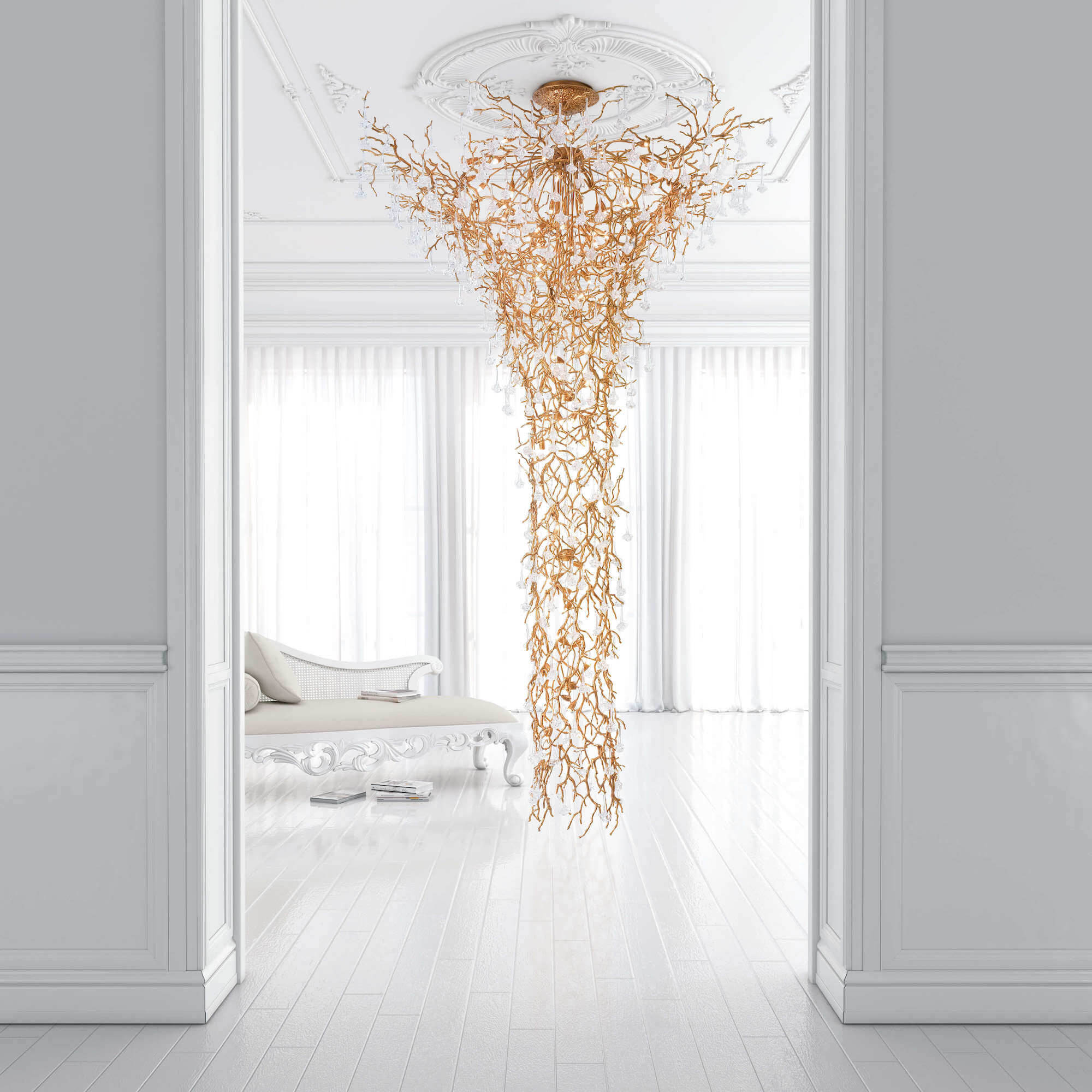 Inspired by the beauty and natural complexity of coral reef shapes, the Coral Collection stands as a dense structure of intertwined metal branches aiming for a faithful representation to its nature and visual impact.The glass pieces fall into the glimpse of marine organisms in a visual combination of great impression. Dense and robust, this collection integrates a complex system of detail aiming for a differential presence.