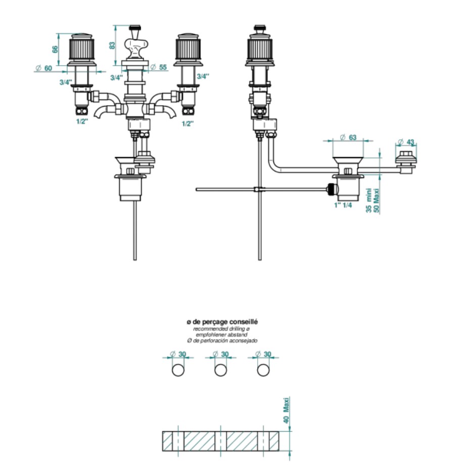 3-hole bidet set, with ascending spray with waste