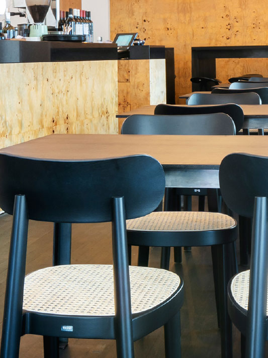 Minimalistic and honest, at the same time elegant and fine: the 118 chair is a classic wooden chair that adds subtle elegance to any dining table or restaurant. The principle of reducing a chair to the fewest elements possible was introduced by Michael Thonet in the mid-19th century. The 118 chair is a continuation of this principle and, with a nod to the company's heritage, it takes it one step further. Sebastian Herkner added sophisticated details, which make the design less dominant and therefore even more distinguished. The shape of the chair’s legs is another special feature: rounded on the outer side, straight on the inner side – a design that alludes to the horseshoe shape of the seating surface. The bent seat frame and the hand crafted seat covered with wickerwork refer to the original archetype of a Thonet chair, no. 214.