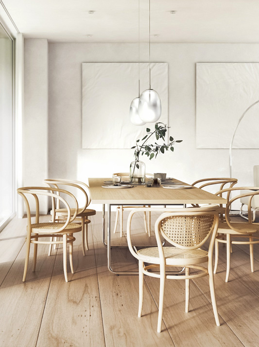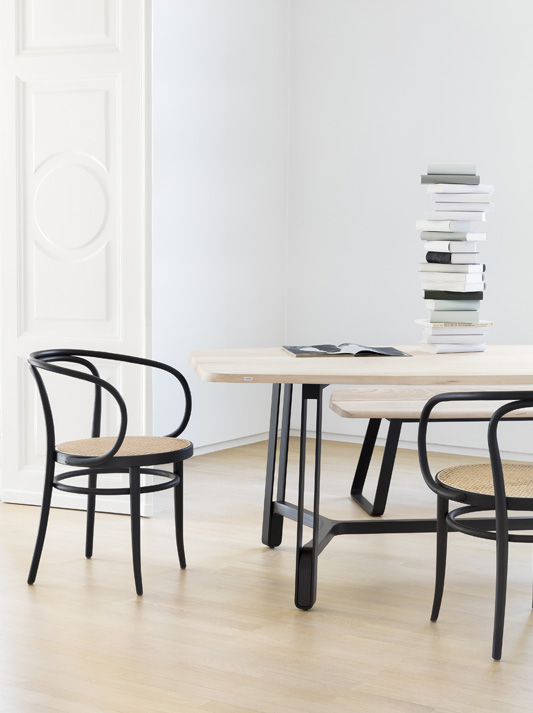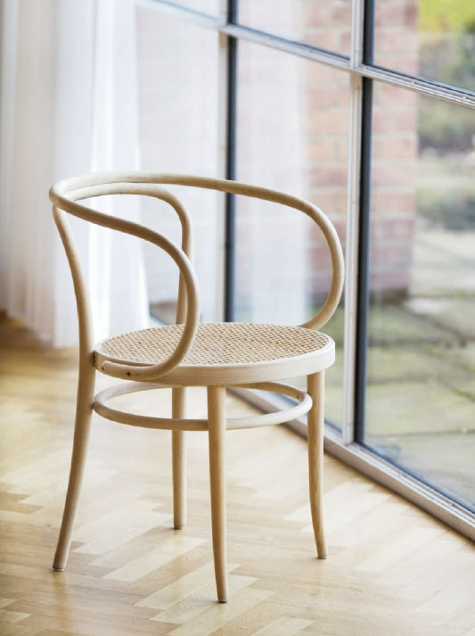 This elegant bentwood classic is a masterpiece in its construction and production: the projecting frame that forms both the backrest and armrest is bent into its form from a single piece of solid beech wood. Like the original model of all bentwood chairs, no. 214, chair no. 209 also consists of only six parts. Due to its aesthetic reduction in combination with the organic form, it almost looks like a sculpture. Swiss architect Le Corbusier was fascinated with it and used it in many of his buildings, for example the Weissenhof Estate in Stuttgart in 1927. He once remarked that this chair "possesses nobility.“