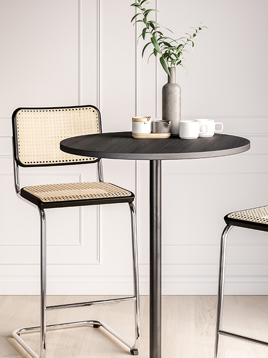 James Irvine has developed tables to match the barstool S 123. They are formally reserved, robust and easy to care for – and therefore perfectly suitable for the contract segment. With their different heights, tabletop shapes and surface versions, they fit into any environment.
