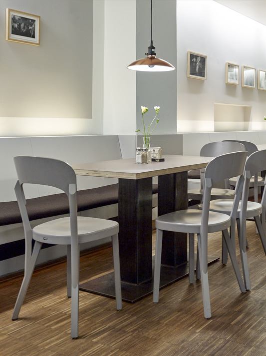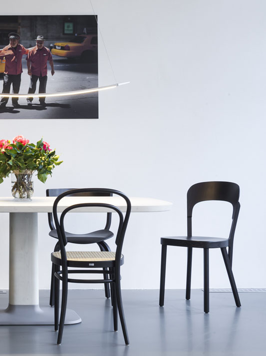 A feast for the eyes: the 107 chair is particularly suited for use in restaurants and cafés, thanks to an excellent combination of elegance, stability and lightness. With its simple form, it also lends itself perfectly for use as a dining table chair at home. With the 107 chair, designer Robert Stadler continues Thonet's successful café and bistro furniture tradition. This wooden chair with its elegant form and comfortable feel is almost completely machine-produced, easy to clean and sturdy. The offset backrest is a particularly striking feature that serves as both a constructive and a design element.
