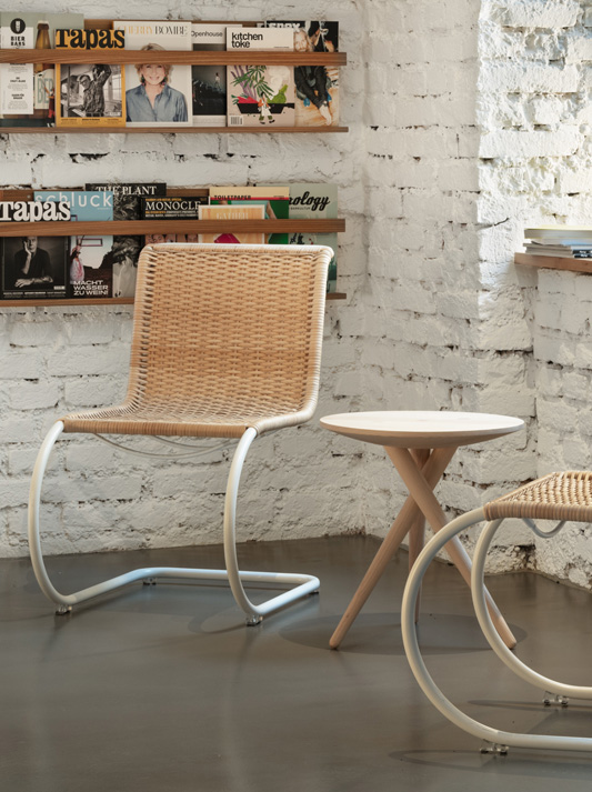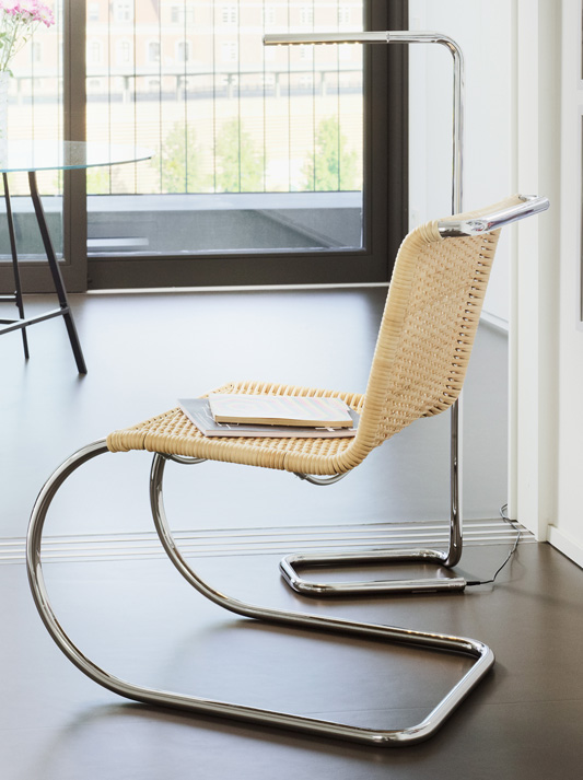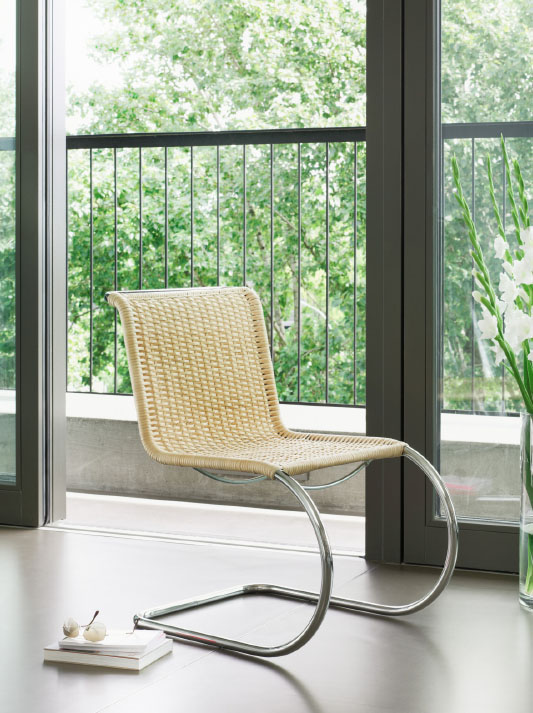 Technology becomes furniture; a striking invention becomes an elegant interior design object. Ludwig Mies van der Rohe was the first to provide the cantilever chair with aesthetic lightness and to relate it to its environment with curved lines. In the run-up to the Weissenhof Estate exhibition, which he organised, Mies van der Rohe became familiar with the principle of the cantilever chair thanks to Mart Stam. As new as this approach may have been, Mies van der Rohe was not impressed with its first implementation by Stam. He immediately answered the technological innovation with his own aesthetic solution, which he was able to present in 1927. The S 533 is one of the first cantilever chairs, and it defines the surrounding environment with its large, elegantly curved circular tubular steel form. The S 533 is characterized by an intentional restriction of materials used, the elegance of lines and the transparency in its effect.
