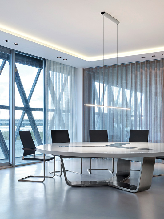 A sculpture in space: the conference table system S 8000 by architect Hadi Teherani combines high functionality with perfected quality and visual lightness. Like a ribbon, the elegant metal base bracket continues on the surface of the tabletop where it becomes a functional surface – the central element. Multimedia modules can be individually integrated. Cables run invisibly in the supporting base structure.