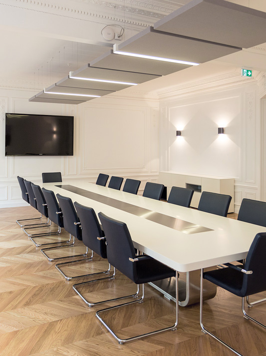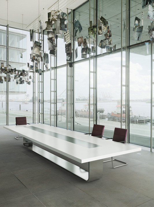 A sculpture in space: the conference table system S 8000 by architect Hadi Teherani combines high functionality with perfected quality and visual lightness. Like a ribbon, the elegant metal base bracket continues on the surface of the tabletop where it becomes a functional surface – the central element. Multimedia modules can be individually integrated. Cables run invisibly in the supporting base structure.